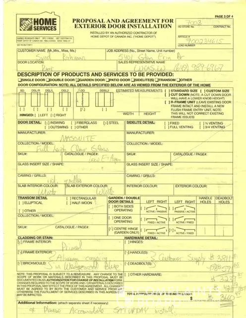 Jeldwin Dbl Entry Doorway Order ID H2557-164353 — Dbl Doors Purchased with Additional charge for Door frame support — Over charged for Additional Labor Dbl Labor Cost but there was not required extra work provided — Did not complete the installation left holes in door and side light framing — Home Depot Sales/ Rick steed all will be taken care of...