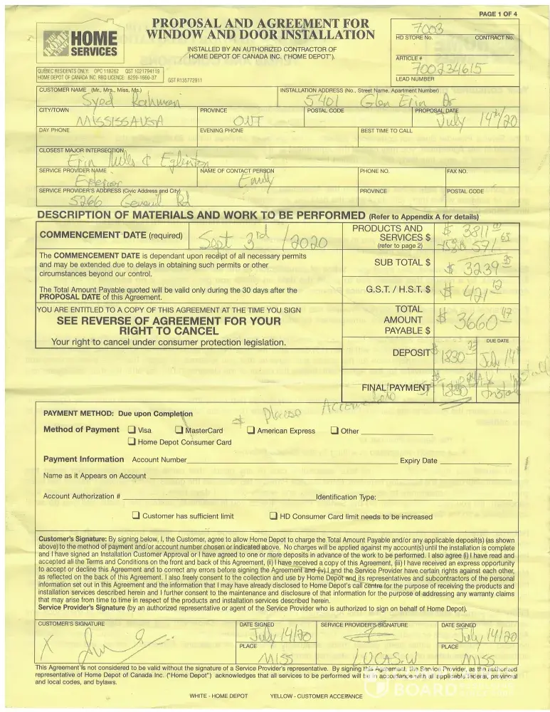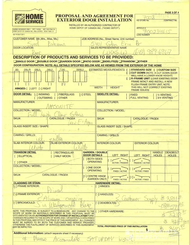 A contract was signed with Home Deport to replace and install a patio door at my house at 5401 Glen Erin Drive, Mississauga, ON L5M 5C8.
