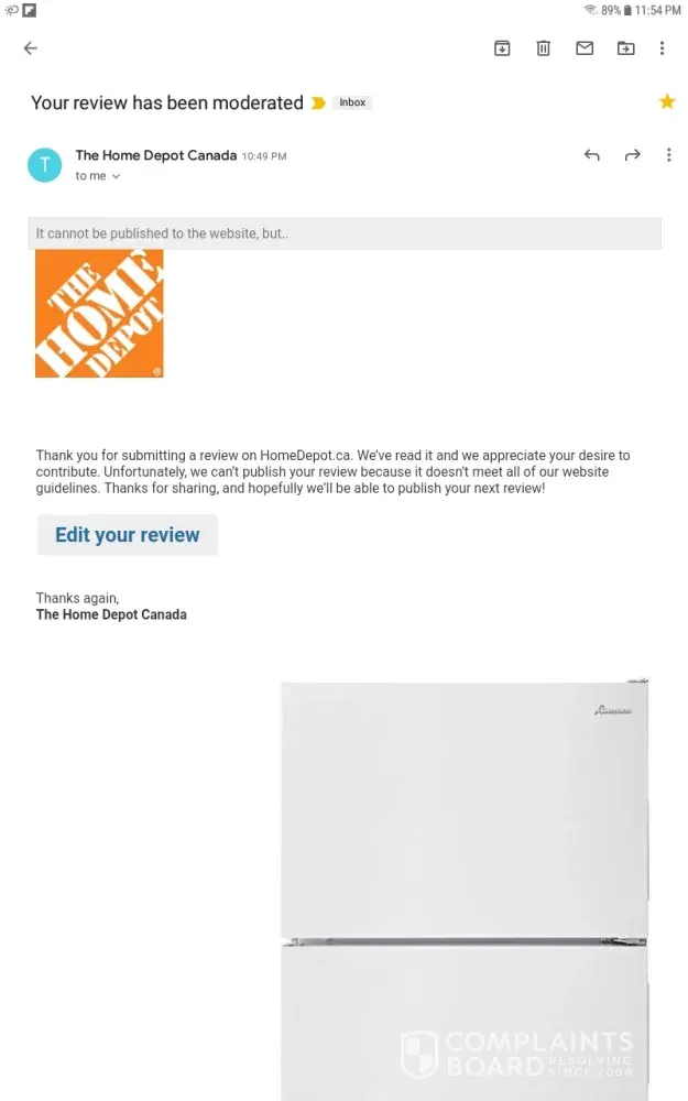frigidaire fridge delivery and customer review censorship