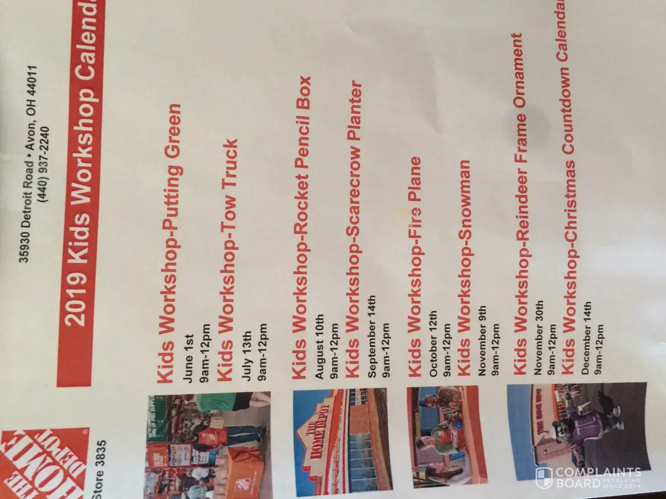 Good morning, My son has been coming to the Kids Workshops every month for more nearly three years with his father. Last month, the store gave us a schedule of the upcoming workshops, which differentiated from the typical first Saturday of the month. This morning, they went to Home Depot, anticipating making a tow truck, which he was really looking...