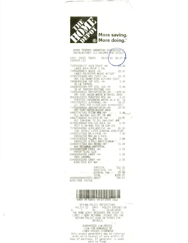 .. Receipt from Home depot online Copied and paste (Internet # [protected] Est Pickup Date: May. 26 - Jun. 1) Order Total 262.19)