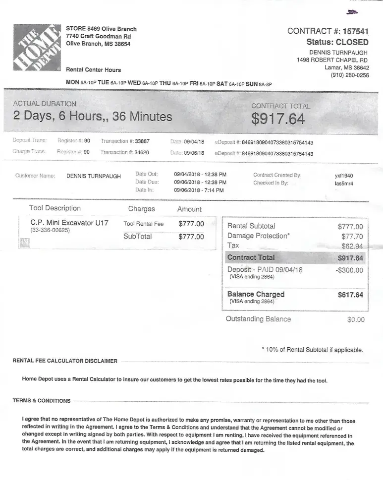 I believe I should be further compensated in this situation. I do not know if a trainee initially rented the excavator, but I know upon return the trainee was left alone to handle the return and openly told me so.in either case, the charges and procedure was not adequately discussed with me or the fact that I could take it back home for the week. As my future rental needs from Home Depot may depend on this, I am asking you to review this and find a more equitable solution for the $188 difference, and am including 3 attachments: 1) final billing statement, 2) front of managers card, and 3) back of managers card with hand written 20 percent offer.
