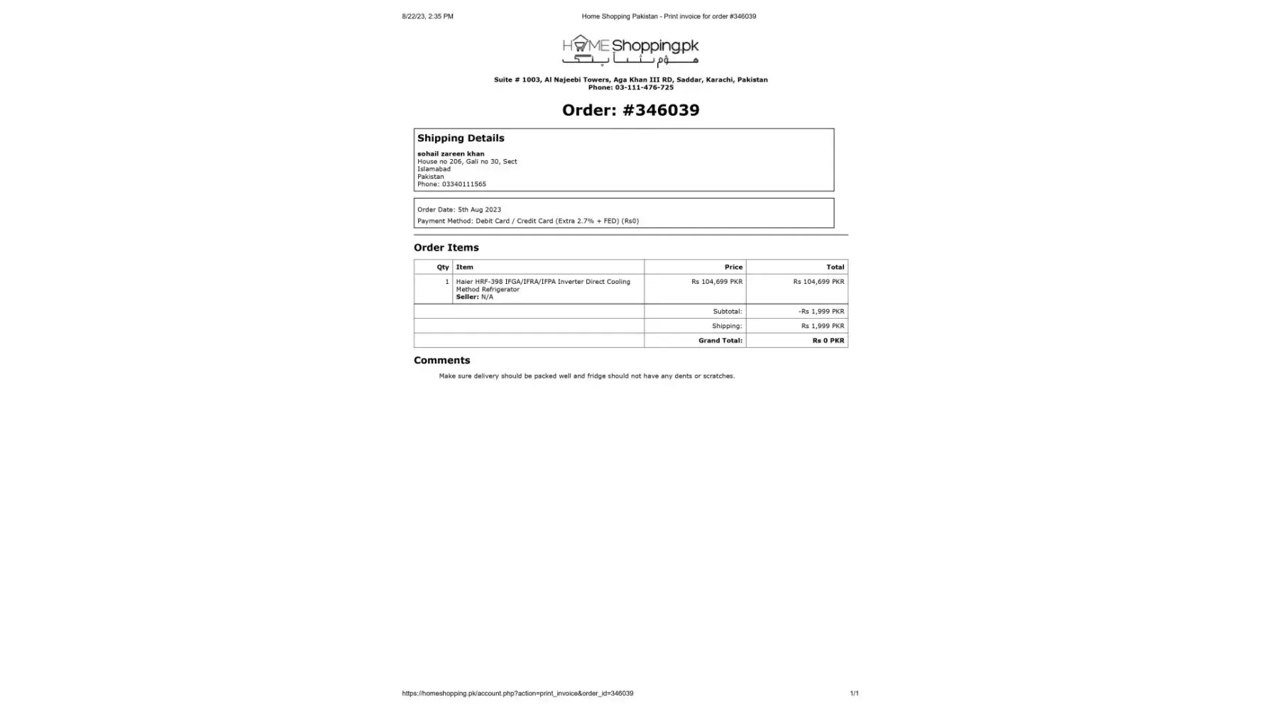 I tried calling Homeshopping customer service and they wouldn't pick up. They have been ignoring my calls constantly... I don't recommend homeshopping.pk to anyone! BE WARE!