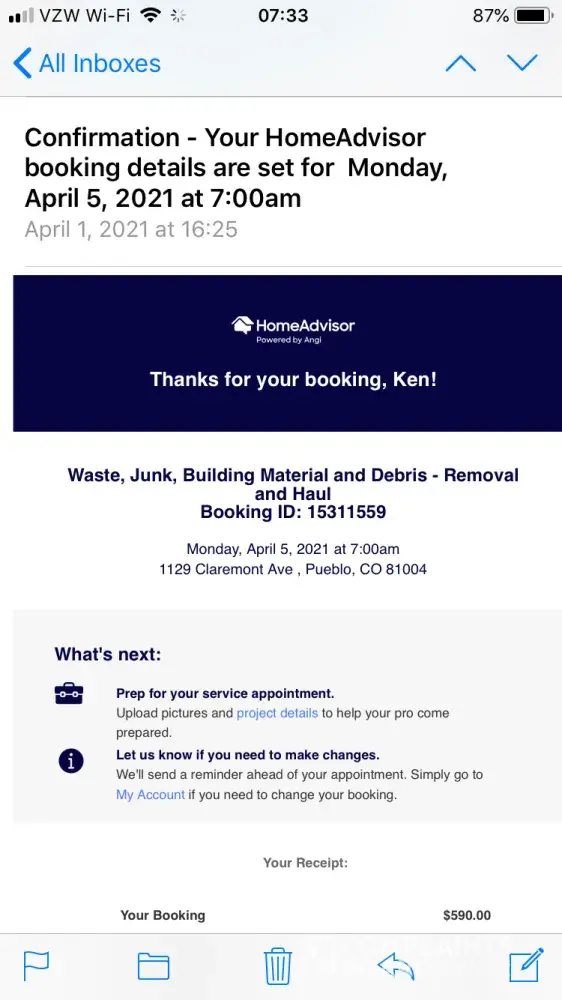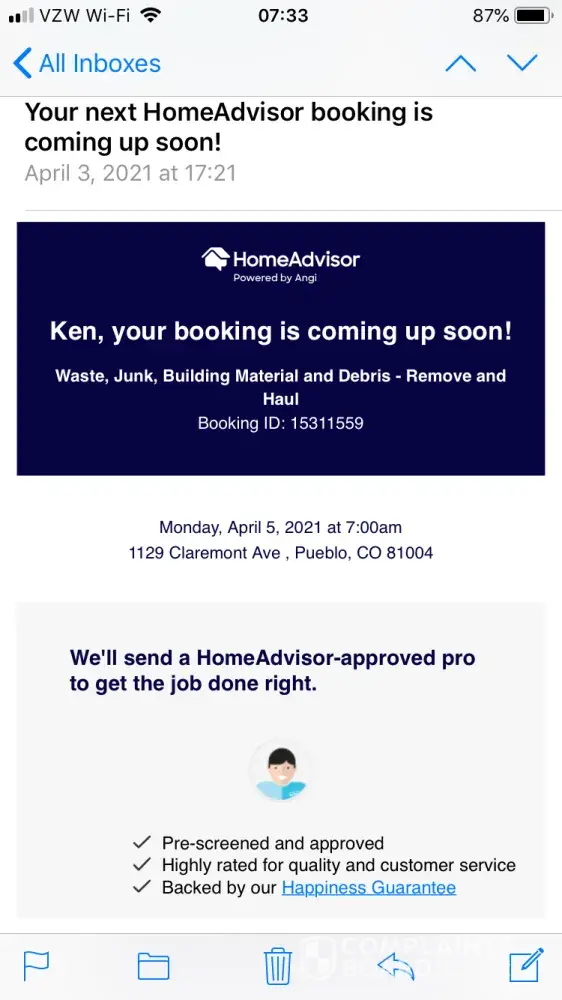 I placed a request for junk removal a WEEK prior to the day requested. I made the request on April 1st. The day that was scheduled and CONFIRMED for MONDAY April 5th at 7 am... The day of I get an email and text, literally minutes before the "CONFIRMED CONTRACTOR" was supposed to show up, saying "Unfortunately, we could not find a professional to complete your Waste, Junk, Building Material and Debris - Remove and Haul service at your chosen date and time". The booking was CONFIRMED! Meaning that there IS A CONTRACTOR AT THE READY! They made FALSE CLAIMS and I have a reasonable expectation to have my prepaid appointment met without exception! To suggest that after 5 days there wasn't an actual person to begin with after TWO confirmation emails and then literally minutes before, there actually wasn't anyone from the start. Then there's the happy Guarantee ... we'll I'm NOT HAPPY and as advertised requires that HomeAdvisor complete the requirements of the job at THEIR COST!