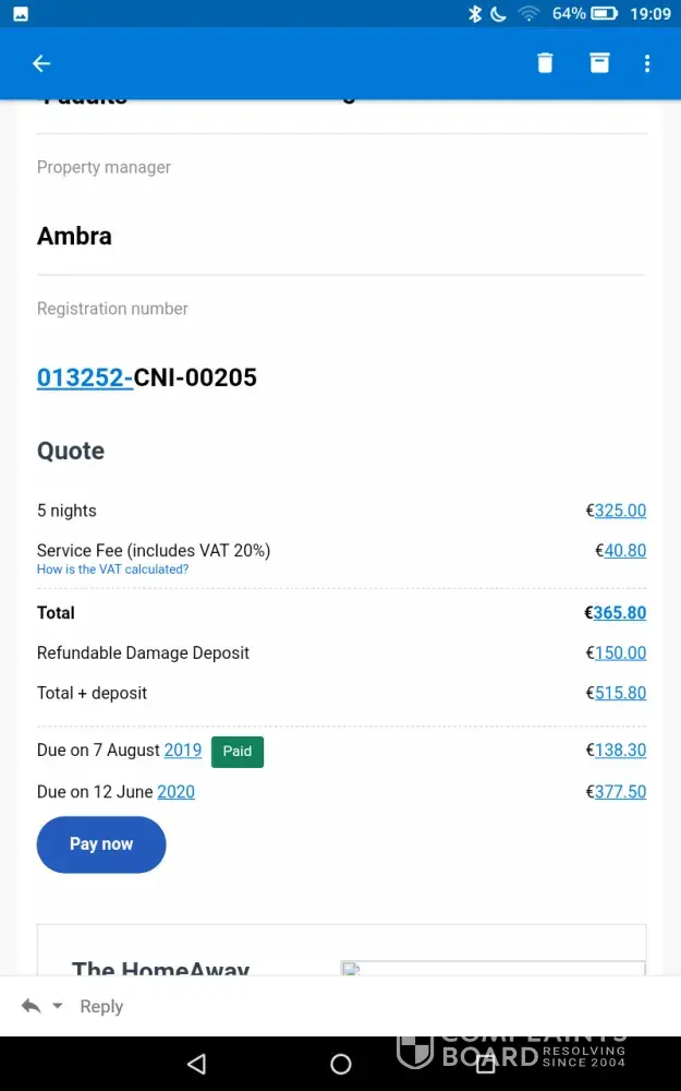 I received confirmation of the booking upon paying a deposit of £131.65 (screenshot 1) However all costs were not stated up front on the confirmation. Ambra the owner emailed on 8/8/19 stating there would be a cleaning fee of 60E payable on arrival. I found this unorthodox but accepted it anyway.