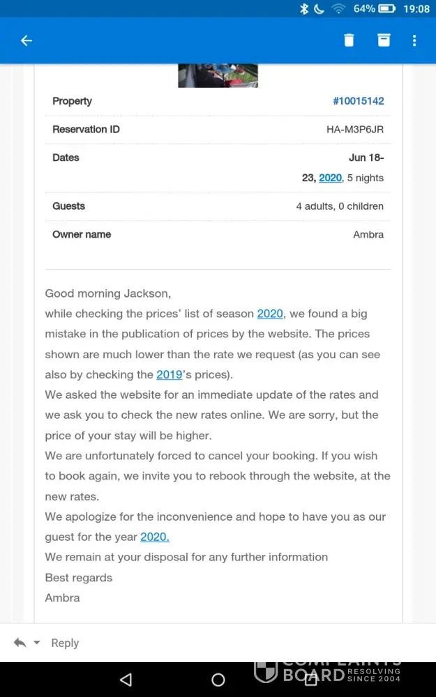 On 24/8/19 i received a further email from Ambra saying you had given the wrong price and that there would be an increase and we should rebook at the new prices. (screenshot 2) She then cancelled my booking and claims to have refunded my deposit ( not visible on my credit card statement) all through your website.