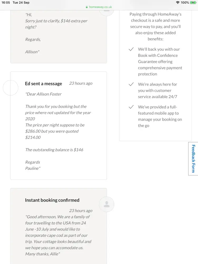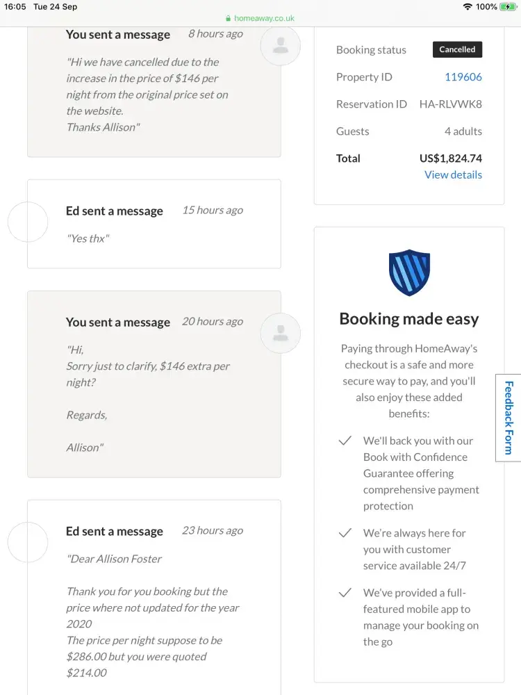 2 issues here... 1, chose rental property ID 297500 on Sunday 22 September 2019. Messaged owner to ask to book, automated response sent back next day advising request not accepted. No reason, just ‘we are unable to confirm your reservation'. This property is still listed for the dates we chose so can't understand why owners declined this booking. 2, On Monday 23 September we chose property ID 119606 which I called up and clarified cost with an advisor while booking on line. This was confirmed at $214 x 6 nights + cleaning + service fee - Total cost + deposit $2124.74. Confirmation email sent 16.07 hours along with reservation ID HA-RLVWK8. Then an email was received from the owner Ed Tessier (or Pauline as it was signed) at 17.00 hours stating the price was not updated for year 2020, price per night supposed to be $286.00 but you were quoted $214. The outstanding balance is $146'. I queried this directly via the messaging and asked if this was $146 per night extra, to which the response was ‘yes thx'. Therefore we have cancelled this reservation and request a full refund along with your response as to why we were declined the first property when it is still listed for the dates we required and secondly why were we asked for an extra $146 a night after the confirmation on the second property had been confirmed? This is the first time we have attempted to book with HomeAway and the experience so far has not been good. We are still looking for a property to match our dates 30 June - 6 July 2020 and your help and assistance would be much appreciated considering the poor service we have received so far. Many thanks. Allison Foster.