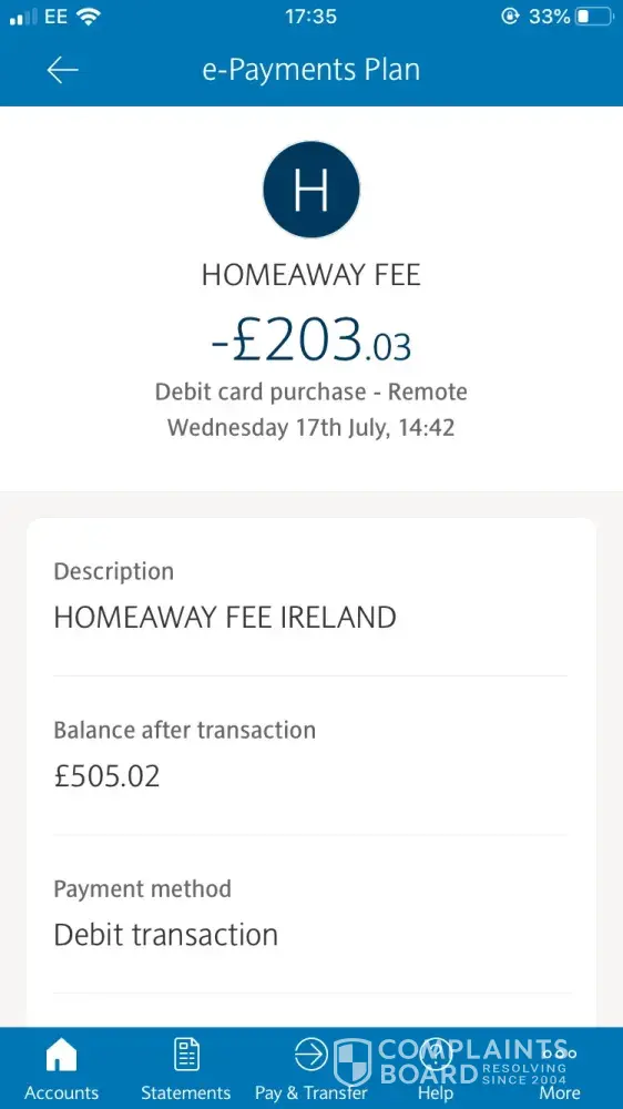 I recently made a booking with Homeaway for a property in Sitges. As the booking was for mid September I was required to pay in full. I confirmed the booking and paid the full amount plus a damage deposit. The following morning I received an email saying the property was no longer available for rent and refunding half my payment. I have been battling ever since to get my money back. I have had many long phone calls in which I was initially told Homeaway could not contact the owner. Then the story changed and I was told the owner had made an error refunding the money. The owners agent tells me the money is held by Homeway until occupancy. Clearly someone was telling lies. This morning, finally, I checked and the refund has gone through. I am £25.97 out of pocket due to charges and conversion rates. Please can I have this amount refunded. Homeway needs to keep tighter control over its property owners and penalise them for such appalling behaviour. I