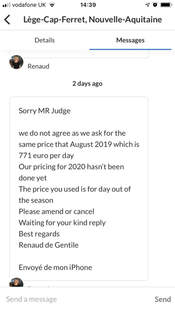 ...last weekend (12/5/2019) and was debited £1, 082 from my bank account on 14/15/2019 automatically but was asked by the Owner to cancel my booking (see attached photo) with them saying that the prices for that week were not as advertised on Homeaway. I did this immediately but I have still not been refunded the money taken from my account.