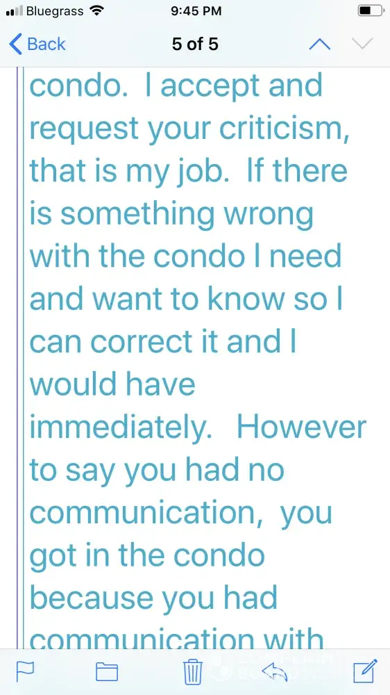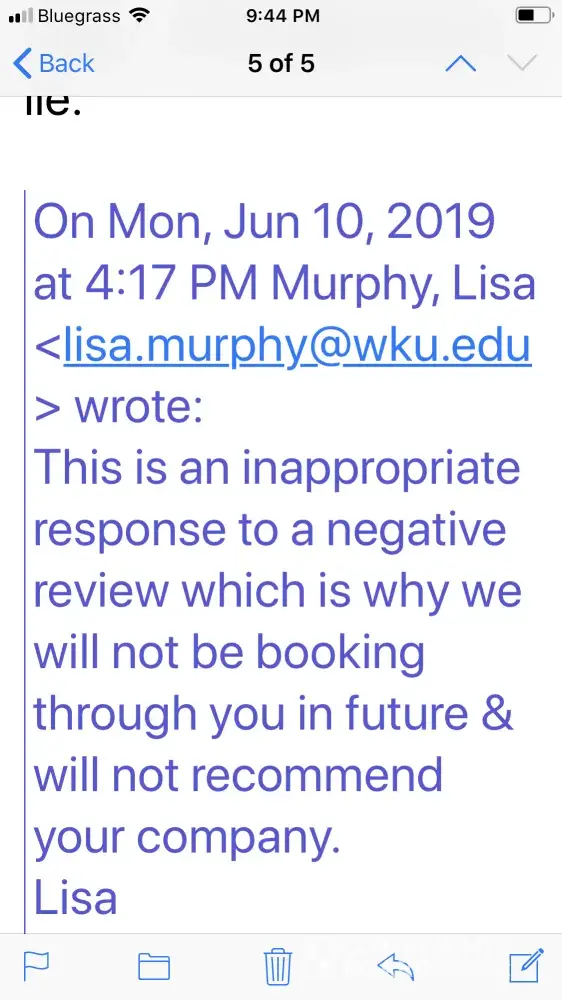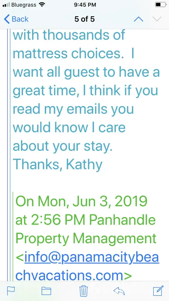 After writing a review that was not completely positive, although I did give 3 stars, I received the following negative emails & even a threat to write negative things about myself. The emails were from Kathy. I called & left several messages but never spoke to anyone while there. I did receive a couple of missed calls but no messages were left regarding issues. This property manager should be reprimanded or taken off the site. I have no problems with homeaway itself & will continue to use this site but I will make sure I talk with owner personally before trip. Please respond to email below.