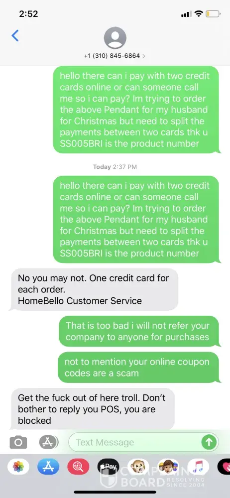 We ordered a charm from this company, they charged our credit card 4x then never sent the charm, couldnt find a phone number anywhere on their website so I sent an email through their online submission form (This was after my finance tried to reach them three time to no prevail) I told them I wanted a response right away or I would take my complaint to the bbb and contact my bank regarding the charges. This was the reply email I got from "josh" at homebello. "ohhhh i'm so scared of bbb. A #ucking sham organization who calls me everyday begging me for $299 to change our rating to a+. Get a life" really professional... Buyer beware!