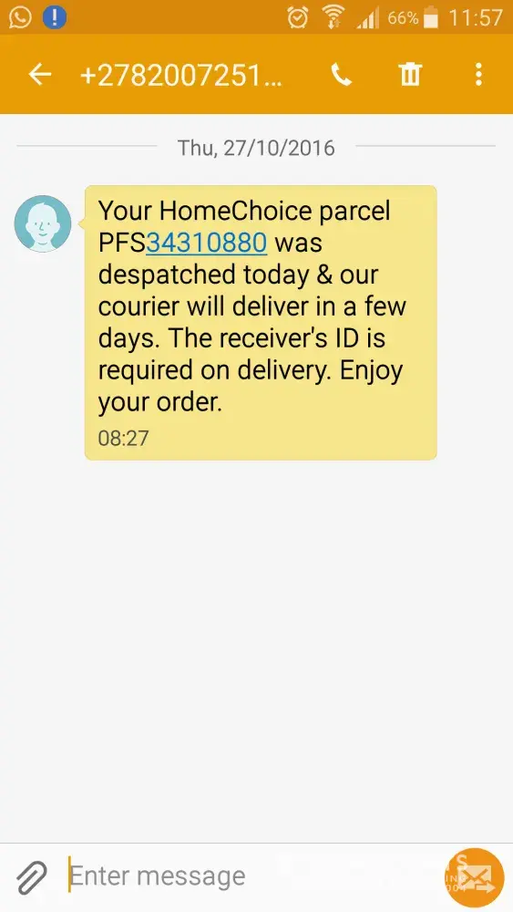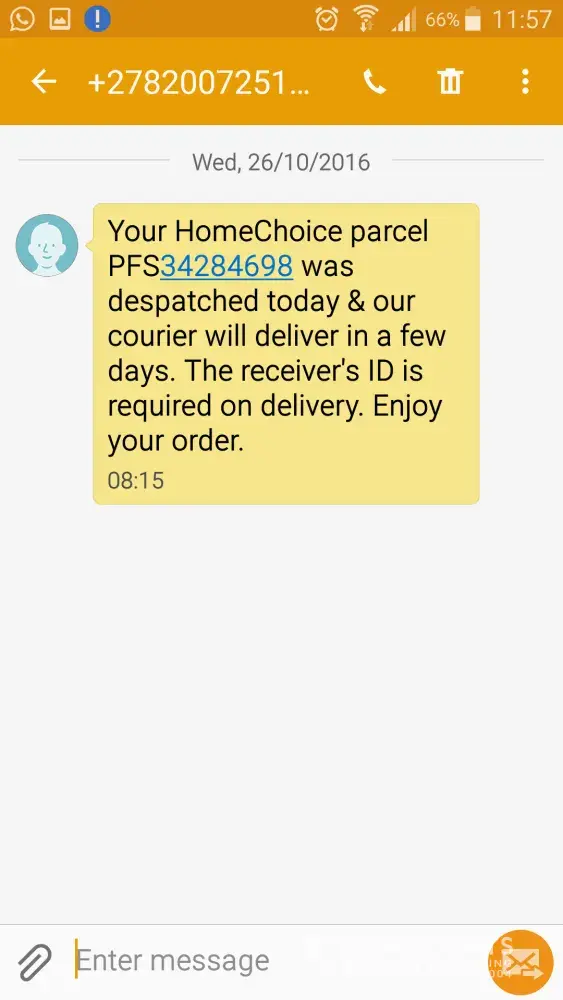 According to “my orders†on homechoice's website, the above order was dispatched. I have not received this order. I received a reply email from homechoice confirming that the items was delivered. However there was items delivered (another order) I sent homechoice the delivery note confirming what was delivered. When signing for items with the couriers it does not state on the document what was delivered. Only once the box is opened then only one can see whats inside.