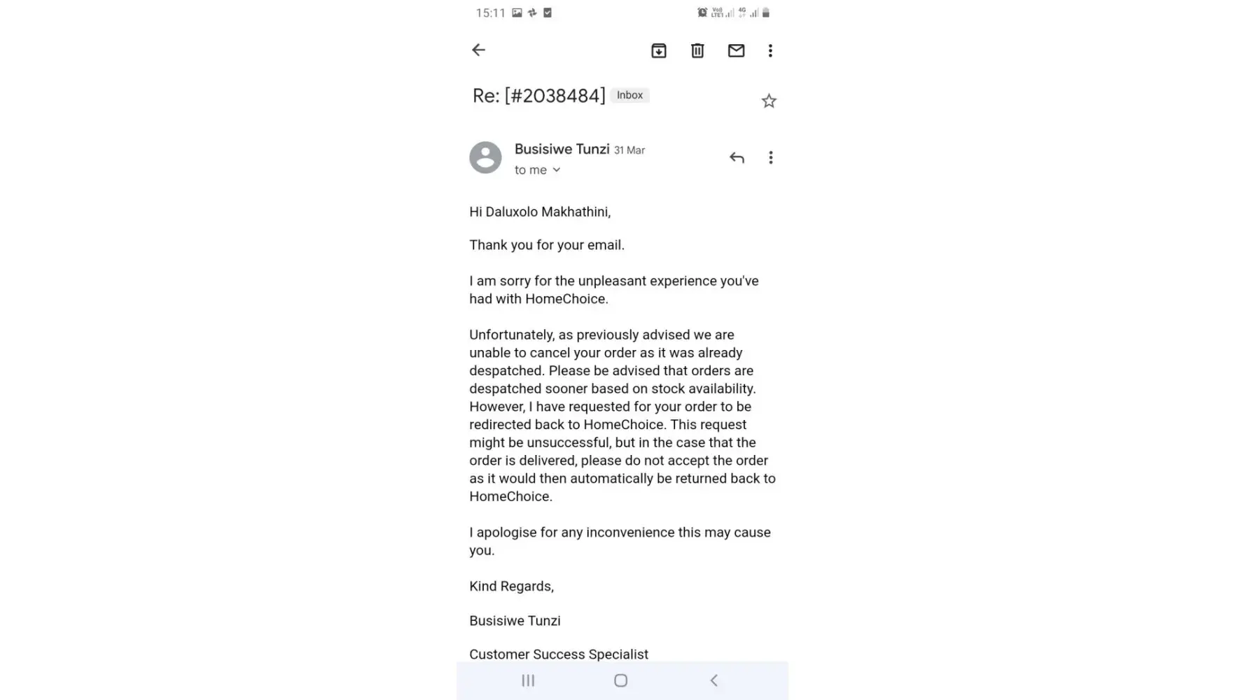 Hi, I have a problem with Homechoice, I have settled my account with them and they mistakenly placed an order for me without my concern I have been asking them to cancel it since on the 25 of March still they haven't cancel it. My ID number is [protected] Daluxolo Makhathini please assist me I need them to cancel it actually I need them to cancel my account with them because I have settled my account.
