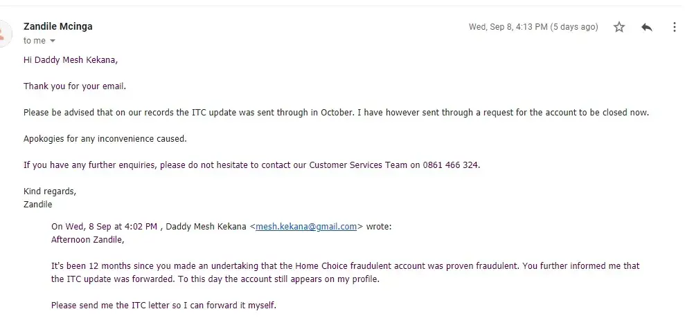 I did call Homechoice over the phone and laid a complaint but haven't heard from them. I also sent a complaint with clearscore so that they may remove this account from there. They advised that I should lay a complaint.