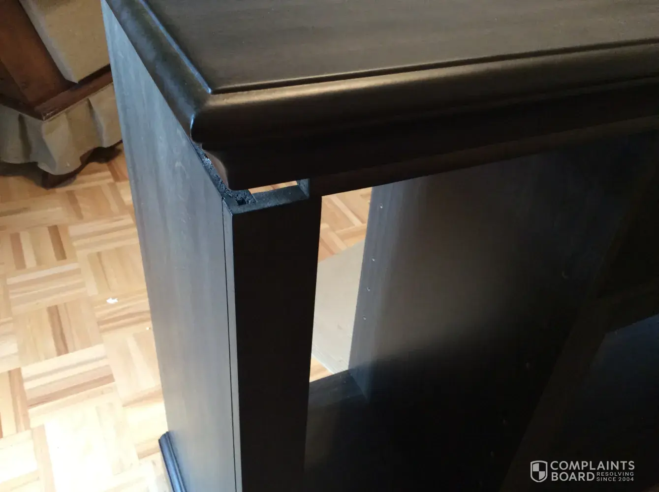 The back for one piece of furniture (bookcase) consisted of three sections taped together, none of which appeared to match the finish of the furniture and one section appeared unfinished with large splotches on it as if something had been spilled on it and eaten away at the surface of the wood or the wood had otherwise been damaged or was defective.