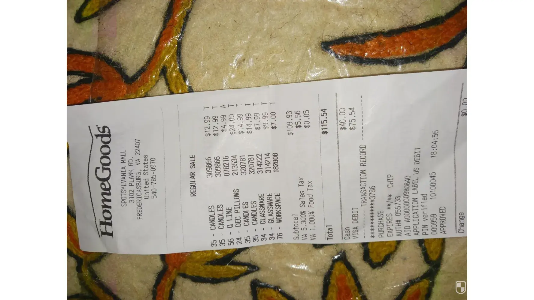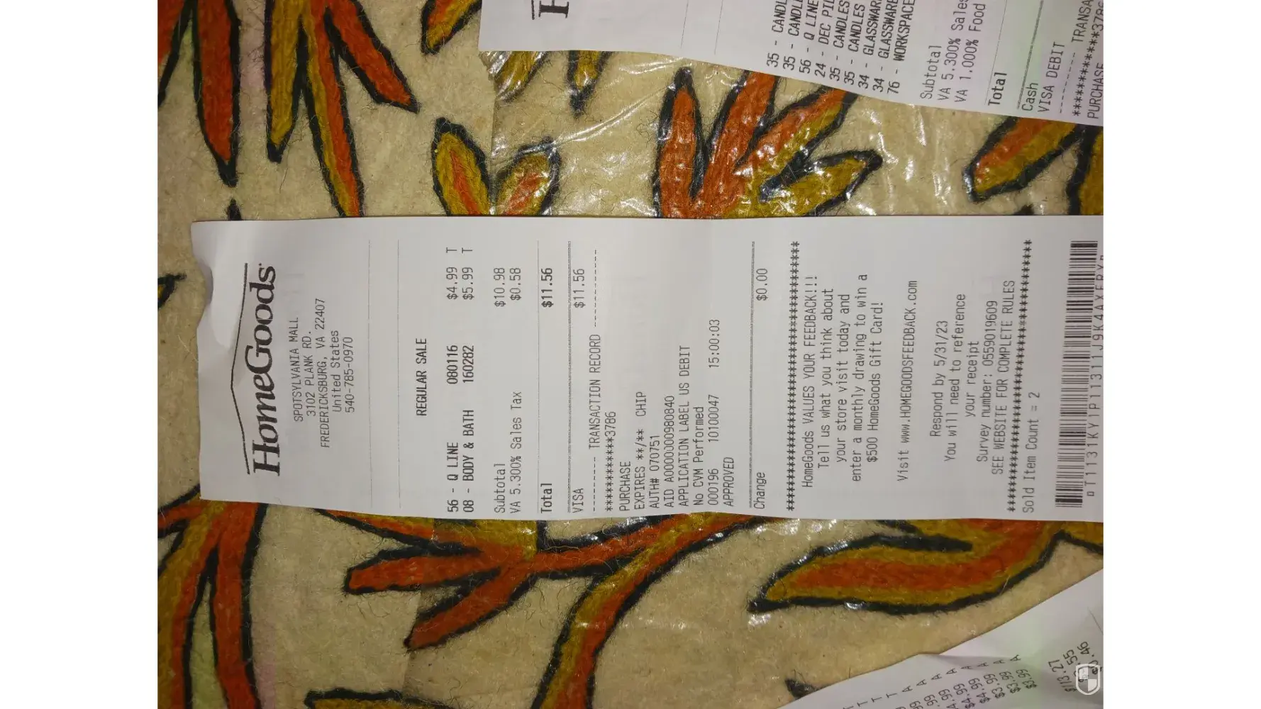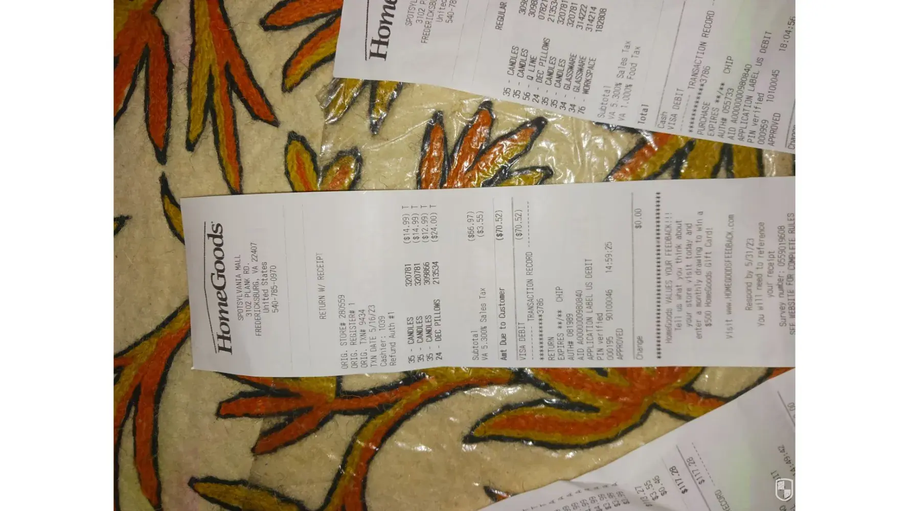On 05/16 at 8:05 o'clock I bought 11 items with two receipts that I can provide in homegoods, 3102 plank rd, 22407. Please look at your camera and recording for those items on this date listed above. I came home. Some of them were extra for my home, So I returned the extra items but purchased new items over $130.00. Please look at your camera. One item that...