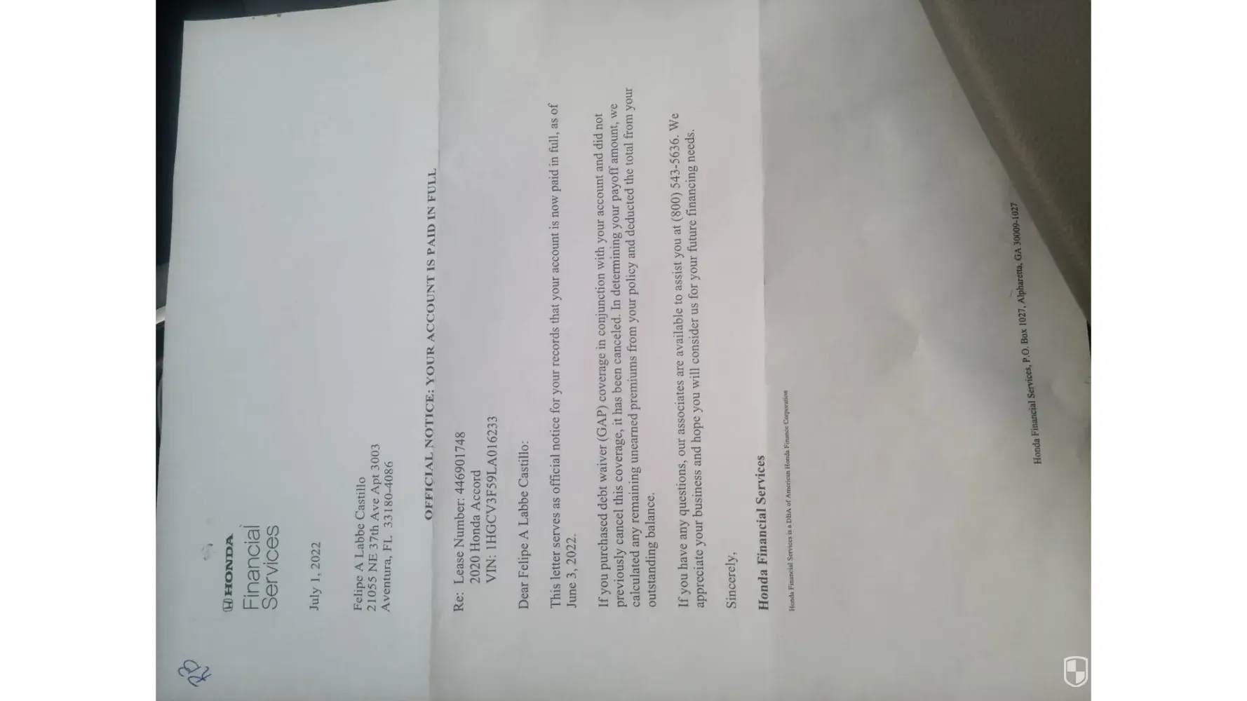 I was disappointed with the lack of communication and understanding from Honda Financial. I offered to pay off the car in full if they would withdraw the 60-day late payment report, but they declined. In the end, I paid off the car anyway to avoid any further issues with the company.