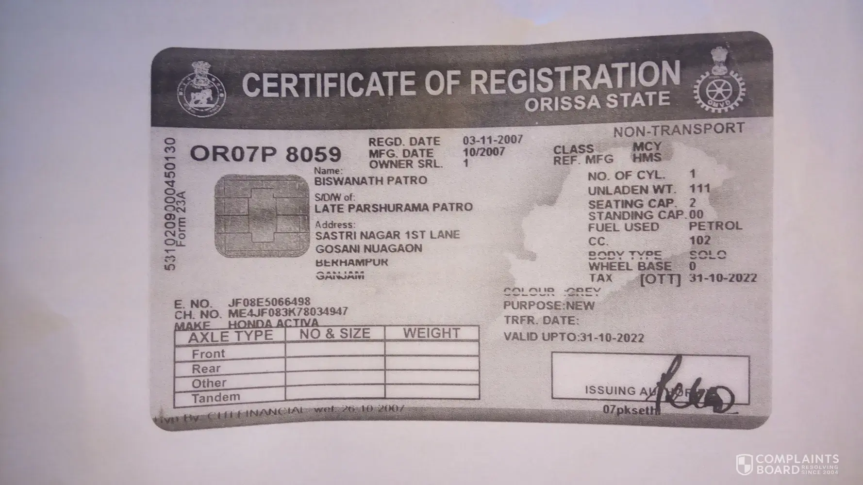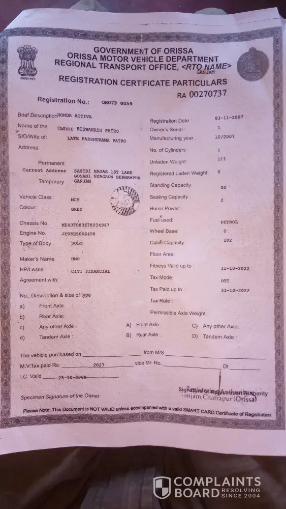 Owner name Viswanath Patro, S/O-Late Parshuram Patro, Address-sastri Nagar 1st lane gosani nuagaon Berhampur Ganjam, vehicle class-MCY, Colour-Grey, Chassis no.ME4JF083K78034947, Engine No.JF08E5066498, Registration date-03-11-2007, vehicle Registration No-OR07P8059, RTO name- GANJAM, Certificate Registration no.RA00270737