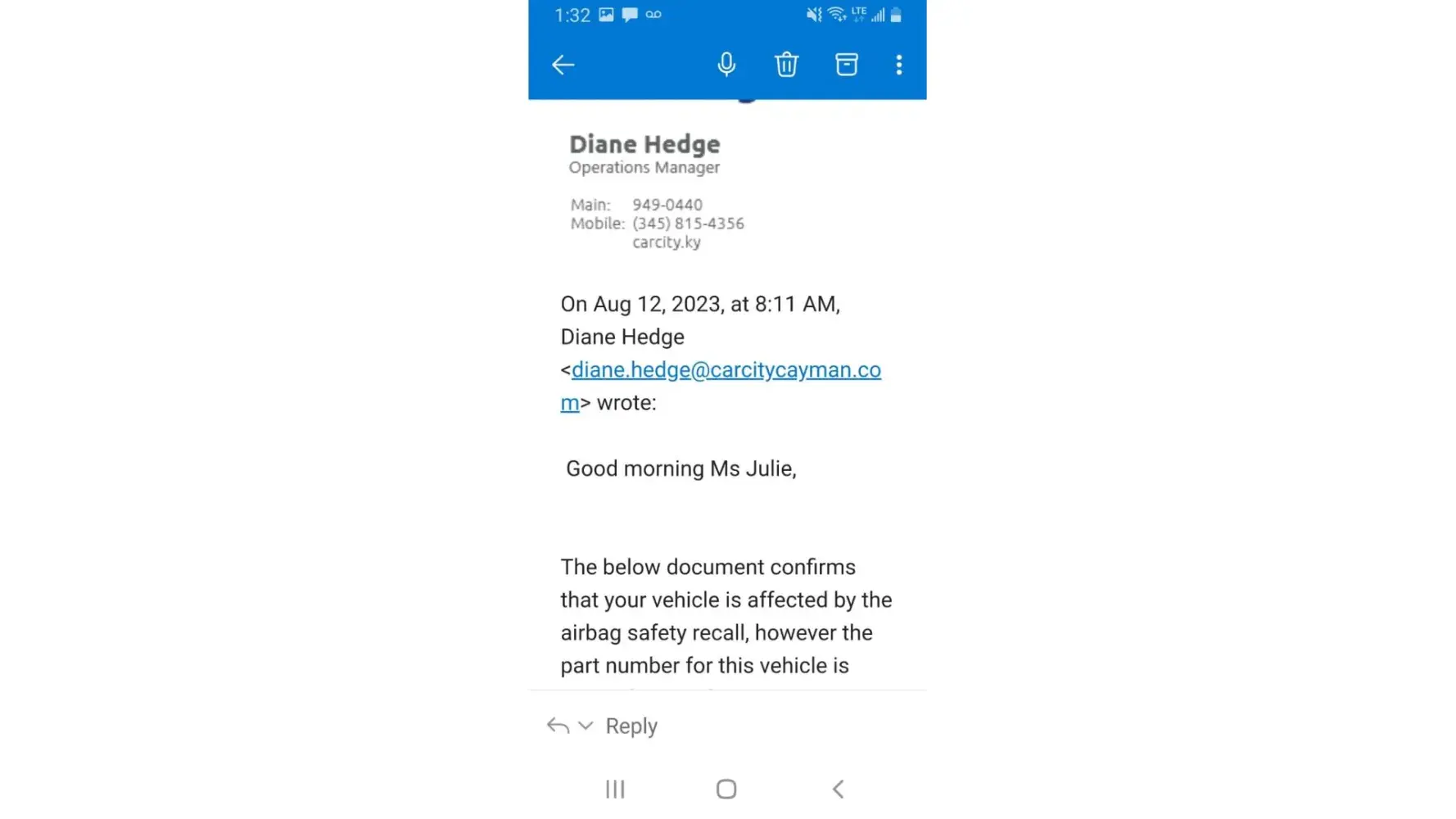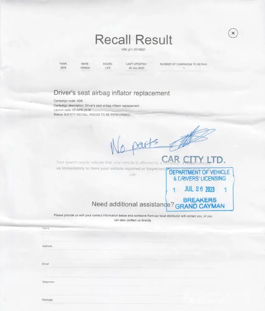 I would like to make a complaint. My Honda bought in Japan and shipped to Cayman Islands. Had its air bag recalled.
