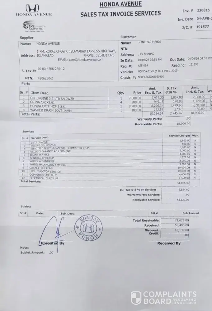I am regular customer of Honda and used many Honda cars. I purchased Honda civic in 2019/20 and maintained by Honda centers ( hand avenue and Margalla). Mostly I have many complaints from Honda Center ( avenue Honda) but I always ignored as per request of staff. Couple of days ago ( like 1 week ago dated 04-04-2024) I had done my routine visit to Honda avenue Islamabad for oil & filters changed but Honda center staff was guiding me some more work is urgently needed, details are mentioned below:-