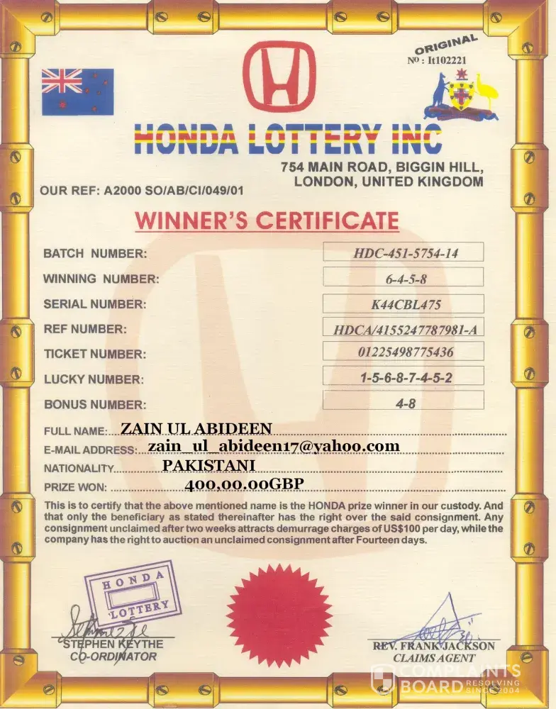 We the board of directors of honda lottery programme wish to inform you that we have release the winners certificate of all the all our lucky winners in our programme of honda lottery programme.