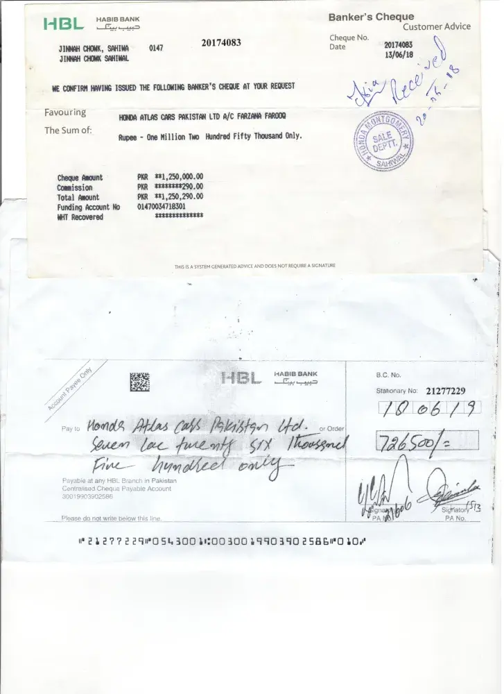 The copy of Draft No.[protected] dated 13-6-2018 of Rs1250000 in favour of Honda Atlas Cars Pakistan Ltd and balance payment of Rs.726500 Draft No [protected] dated 18 June 2019 in Favor of Honda Atlas cars Pakistan ltd is also attached for your perusal please.An inquiry may also be conducted please.