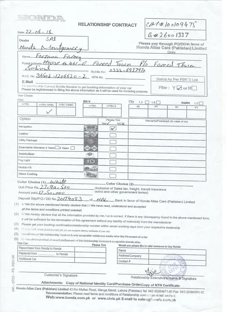 The Car was Booked at Honda Montgomery Sahiwal Pakistan a Honda dealer with Head office