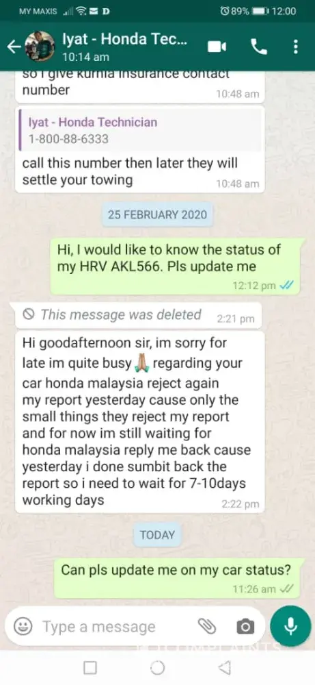 6) What kind of warranty service is honda giving to its customers? We already followed the required rules of warranty which is to require the car to be serviced only by honda appointed service centres & which we met that requirement. Then, when we request for a temporary car we are denied any due to many reasons. Do you know how much of losses incurred to me each and every day without a car to move about? If this is going to go on further and delay my car repair works, I am going to tell everyone in the media social how poor quality honda cars are and also to discourage people from buying but go for Toyota cars instead.