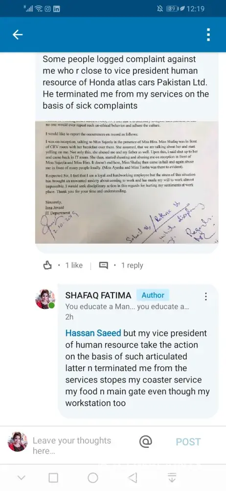 May I ask the reason why he took try revenge to me n dismiss from my rights before this he did try to threat me so many time and calling to my family regarding my life threats in all matter zafar San of HR sohail San of HR nawaz sharif of logistics n aneela naseem of HR n noman San of HR involved in it they misrepresentate to the vice president of HR and create problems for me all the time I also try to lodge my complaint to honda motor Japan but still awaited of positive respond by you