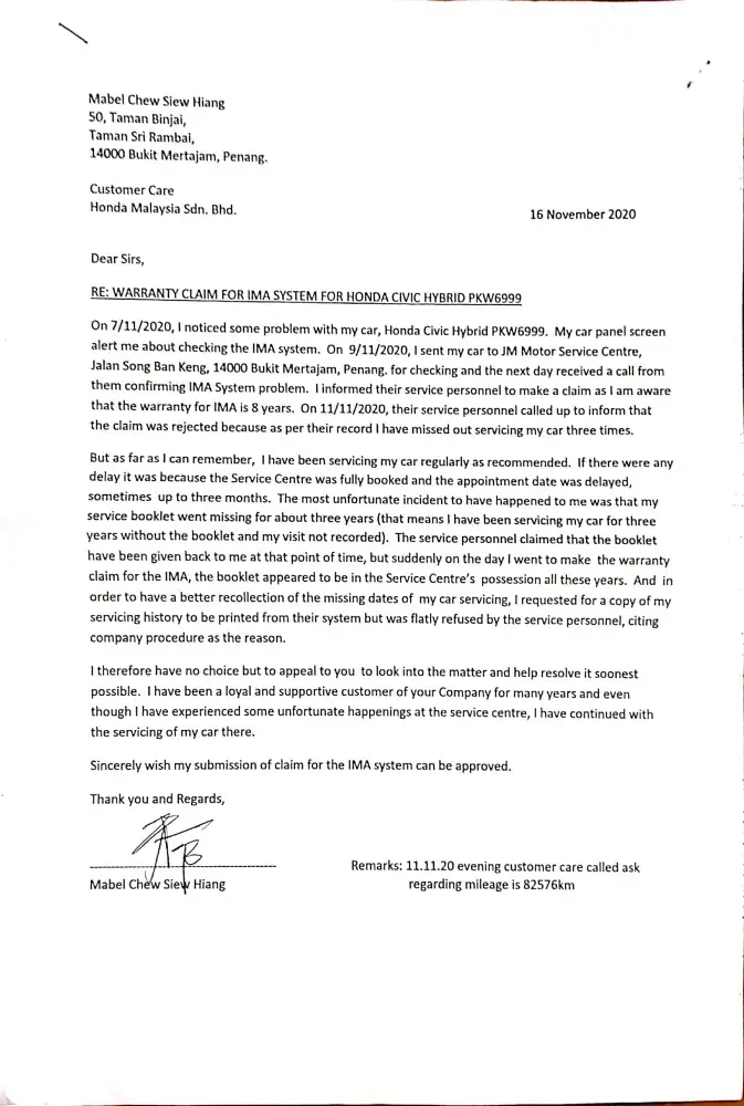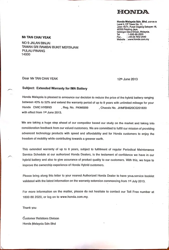 I write this email to you because no any management in Honda Malaysia to help me about problem.