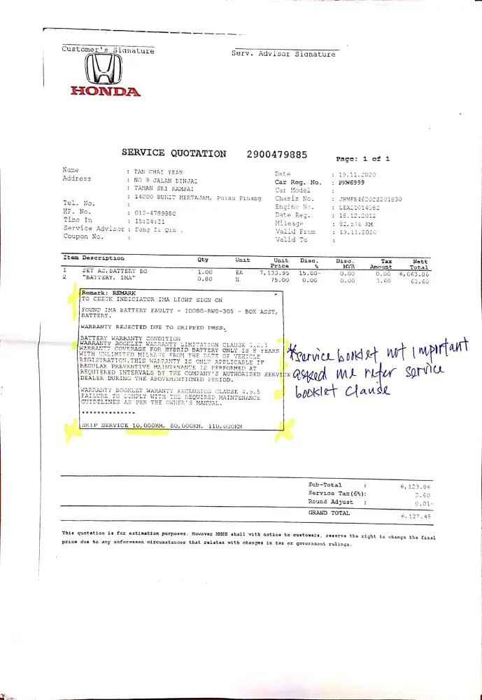 (i) Year in 2017, my service booklet missing in the service time, the next day I went to find them, they said that my service booklet was not on their side and impossible kept the service booklet. but when my car wanted to claim the IMA System, suddenly my service booklet appeared in the service centre, I asked service manager Mr. Ng, he replied that the booklet is not important, the computer system has be records but this is very important to me, it not important, why do with this service booklet? if not important why the quotation asked me to refer service booklet clause 4.9.5
