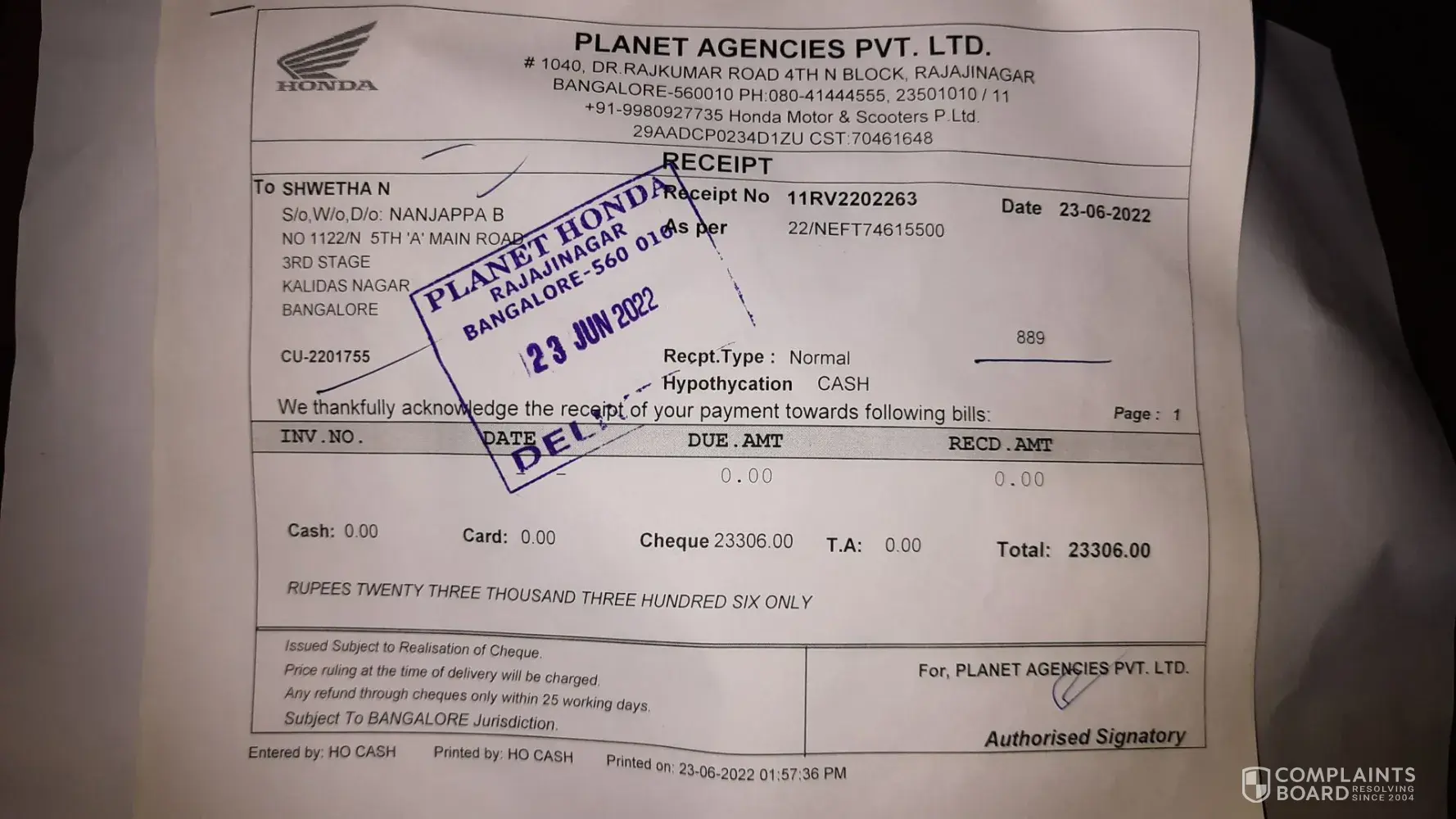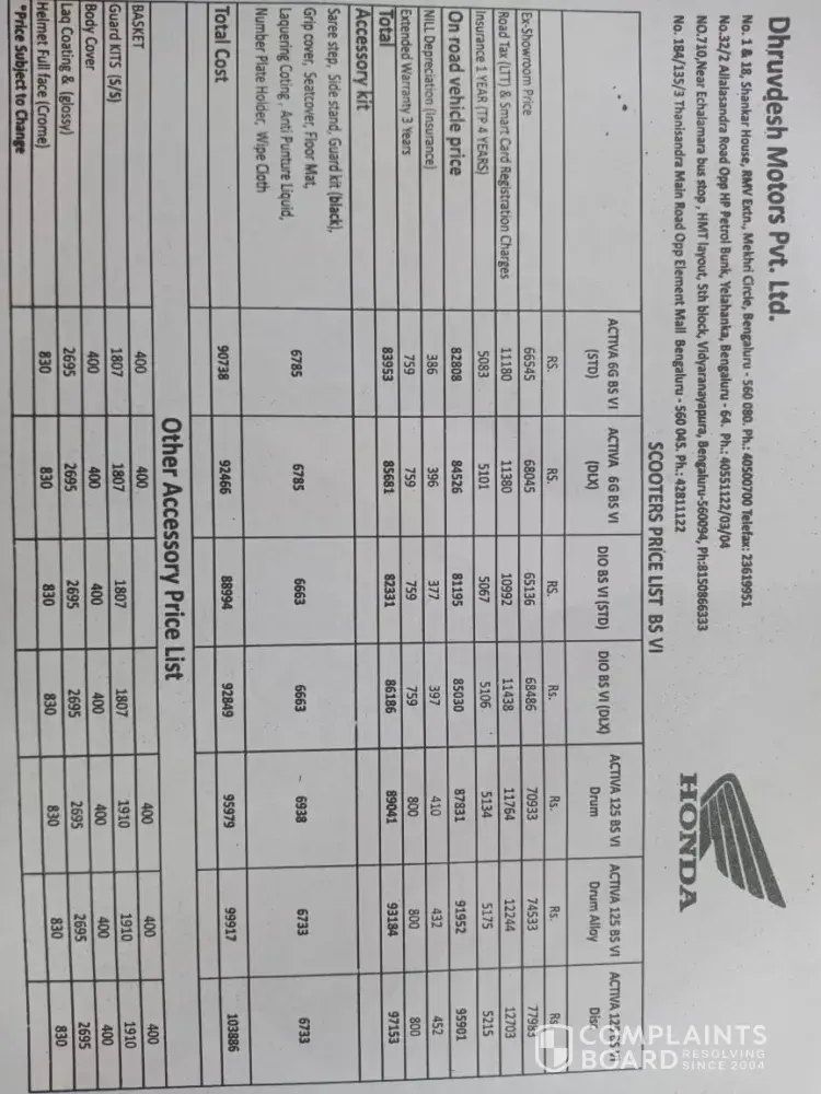 I have made repeated attempts to escalate this matter to both the showroom and the customer care department of the Honda company. However, the showroom personnel simply ignore my concerns, and the customer care representatives only assure me that my complaint has been registered without providing any resolution. To date, I have not received any response from the company regarding my complaint.