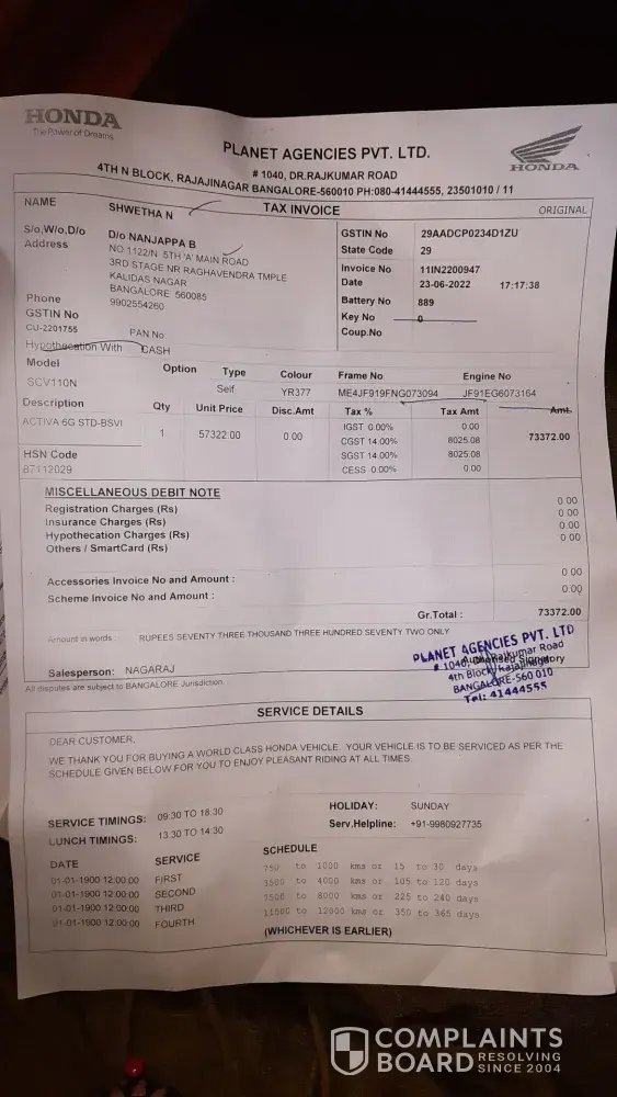 I have purchased activa 6g metallic copper color from rajajinagar, bangalore planet honda on 23.6.2022 I just got invoice still the vehical is nt registered yet n also I didnt get my insurance copy the vehical is defective it is getting excess heat in left n right running board which I couldn't drive I just drive only 15 kilometers totally I felt burning in my both the legs I want my refund back are I ll put a case in consumer court I m also attaching my invoice and photo of vehical where it is getting heated up. and also has they have given defective vehicle cover I have attached all the images