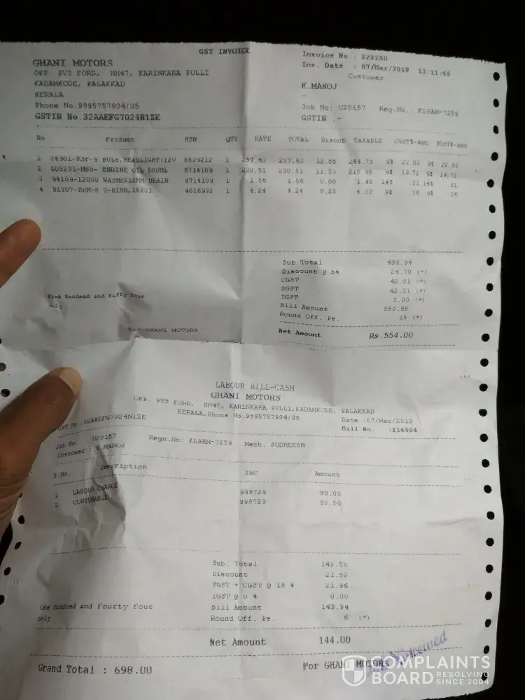 Last month (07.03.2019) I got my Honda Activa 4G serviced from the Ghani Motor's, Kadamkode. Since my purchase of this Vehicle on 02.06.2017, there was no need for headlight change until 07.03.2019 - the day I bought for around 300 rupees including all taxes. This new headlight stopped working today on 11.04.2019, which is just 35 days after my last service at Ghani Motors, Kadamkode. I was shocked at this terribly. This is not just about losing my money, this is about the "huge trust" I have been keeping on Honda Products and Services for a very long time. The first bulb lasted for 643 days whereas the Second bulb, which is also the very first bulb from the Honda Service Centre, Kadamkode (Ghani Motors) lasted only for 35 days.
