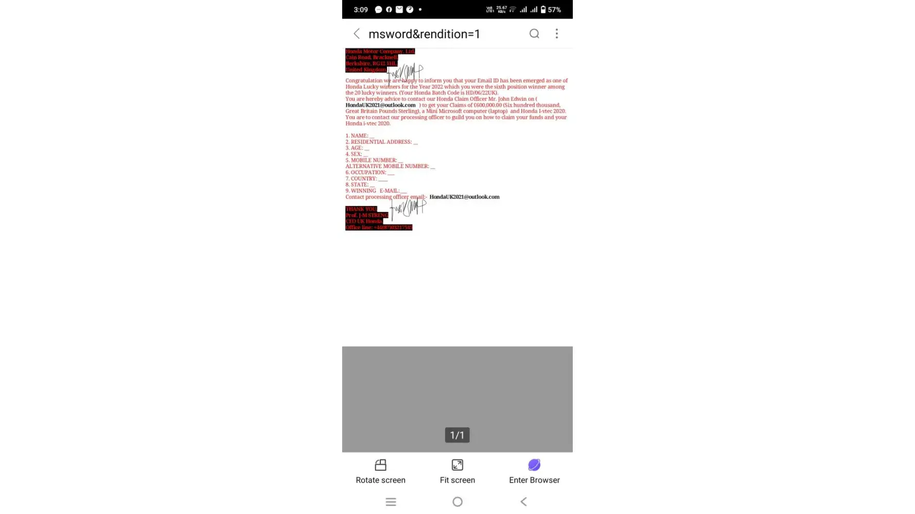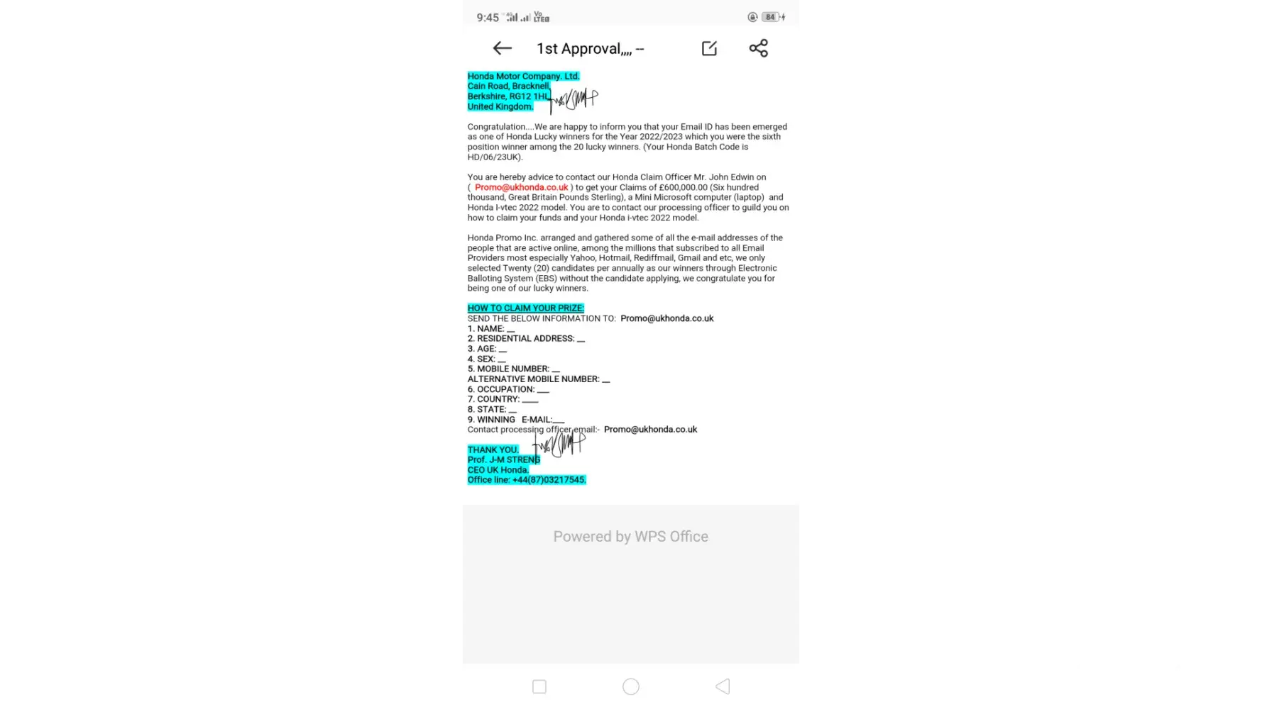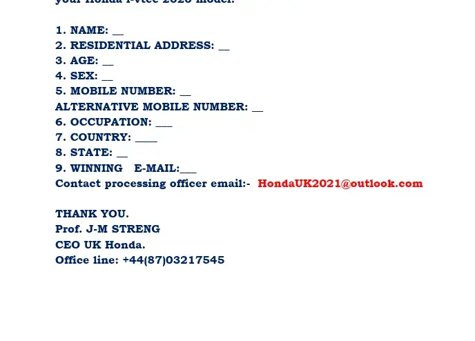 I have received this mail from Honda motor company for lucky winners price with batch code kindly confirm is this true or fake..