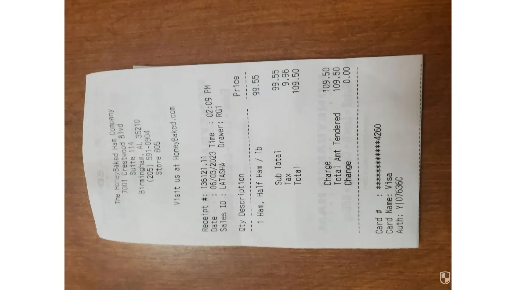 on Saturday, June 3, 2023 I purchased the largest Honey Baked Ham your store had available. Store location: 7002 Crestwood Blvd, Suite 114, Birmingham, AL 35210. The cost before taxes was $99.55 and after taxes $109.50.
