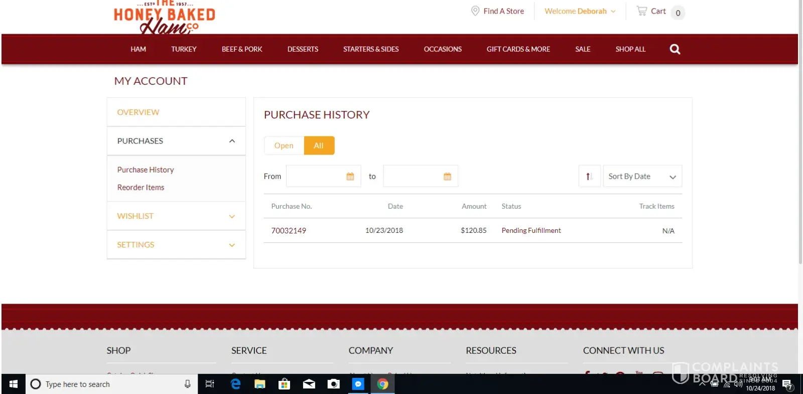 On Oct 23, 2018I ordered for Thanksgiving Dinner from Honey Baked Ham Online and within minutes received a reply with the wrong date (my error). I called Customer service the system was down and the lady said she would take care of the date being changed for delivery. On their online website this morning said the order was pending. I got and email saying my order was shipped and I would receive it today. Called customer service again and they said even though the site was down and I had called I could not return to them and they would not refund my money. I told him this was not my fault that the system was down and customer rep told me it would be taken care of. He hung up on me after stating I should order again and they would give me free shipping. I will never order from them again.