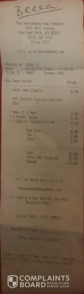 I had a horrible experience at your Overland Park, KS location. Store # 8101. I went to try out Honey Baked Ham’s lunch for the very first time. The food was absolutely delicious BUT the customer service was AWFUL. Was treated VERY rudely by an employee named Becca. I ordered a Ham Classic sandwich with a side of potato salad and Becca brought out my sandwich and walked away, well, after waiting a couple minutes, I figured she had just forgot my potato salad! So I went up to the register and Becca was in the back room and I said, “excuse me, I ordered potato salad too†and she replied in a very rude manner, “I know that†I said, “ok?†She looked at me and said, “I’m just one person, can’t u see that?†Oh wow! Why just not bring the potato salad out with my sandwich? I’M VERY APPALLED BY THIS.