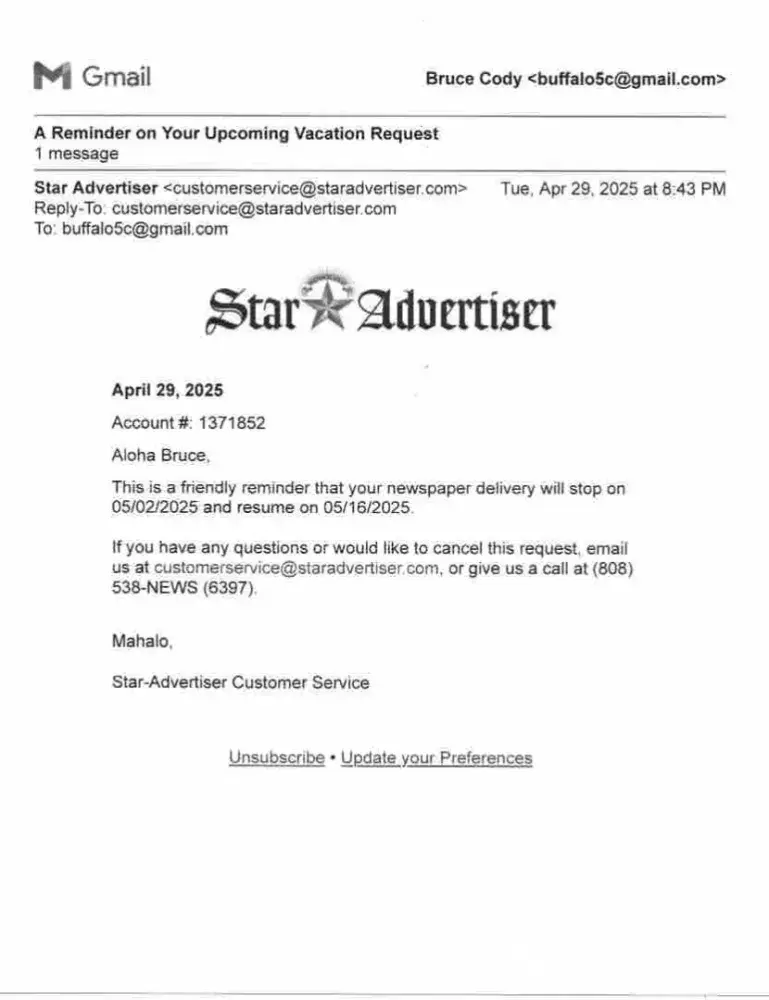Account# 1371852. I made a Vacation Stop request and it was acknowledged by email on April 29, 2025 for the dates May 2 to May 16, 2025. However it was not stopped and there were papers all over my driveway when I returned, just the thing we didn't want happening. Your email is attached. How often this must happen. Would be better to be able to contact the paper deliverer in person instead of relying on the computer.