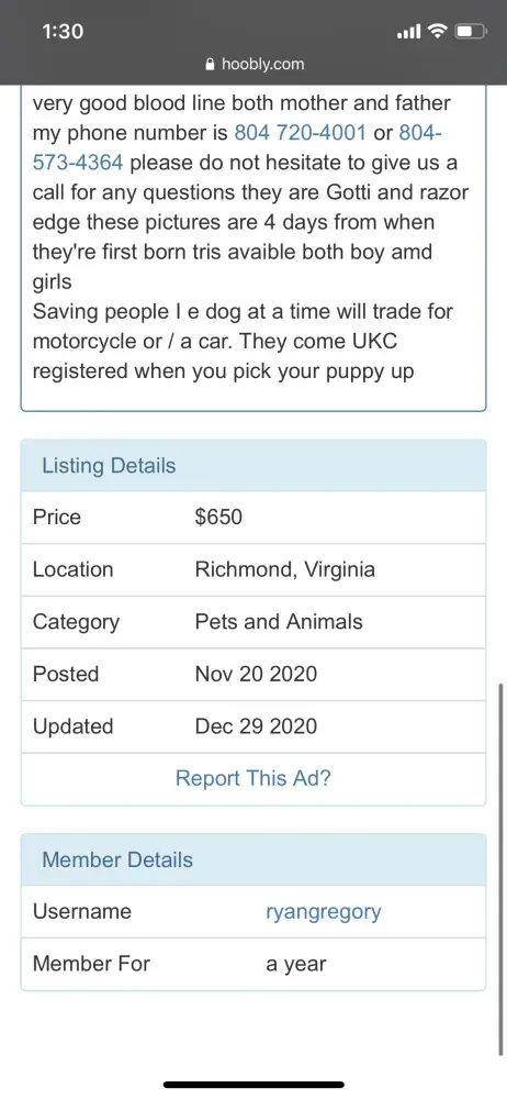 Last year I purchased a dog from user Ryangregory on Hoobly. This was on Feb 1, 2020. His ad listed that they would come with UKC registration papers. When I picked up the dog he assured me that the papers would be arriving in two months from purchase and that he would notify me and mail me the papers. I have followed up with him several times for over a year now. And still have not received any responses. I have contacted him through hoobly and via text. And now I noticed he is selling more puppies and offering papers again. I paid $1000 for a puppy that was supposed to come with papers.