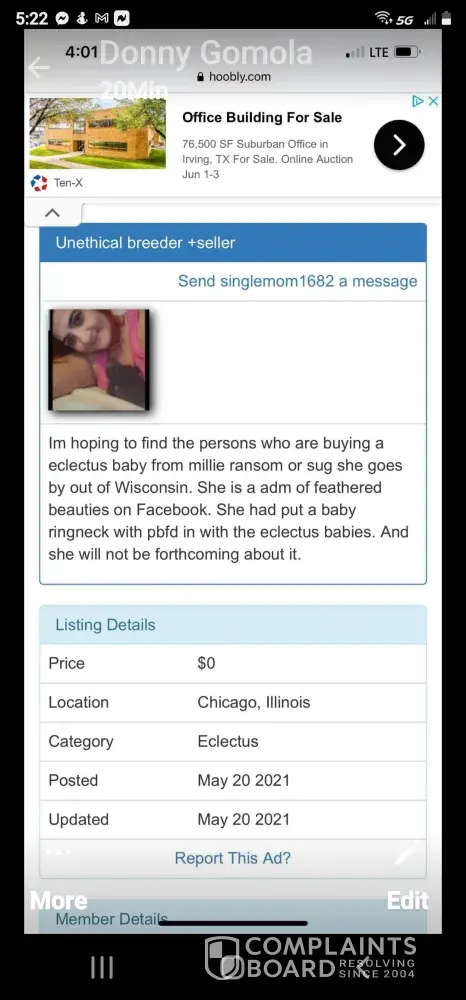 There is a lady singlemom1682 who is saying false information about me and she is using my picture and my real name I want this removed immediately and She is lying about me I do not even have these birds these were her birds that had the disease and she is telling everybody these are my babies I do not even sell those babies these are the ones she sold to me now she has my name all over hoobly my real name and my information I want the post removed immediately