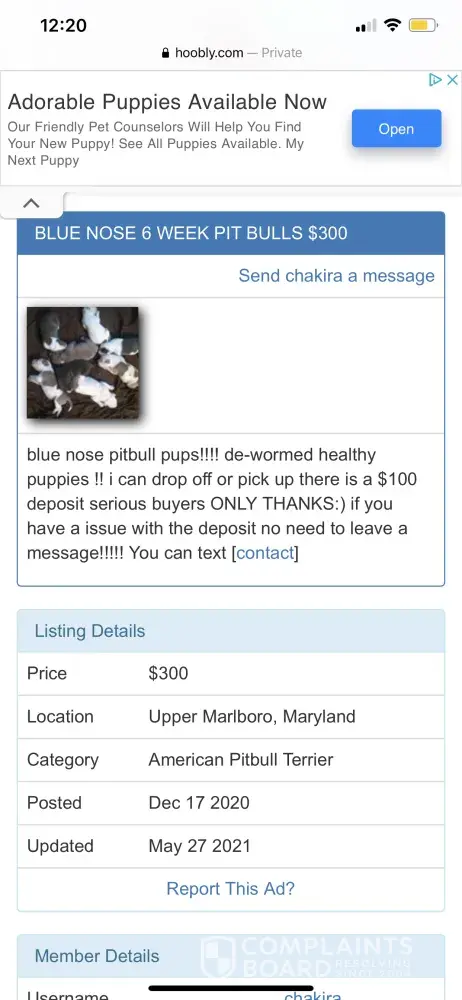 I dont know what it is that can be done, but this ad should be reported as a scam so that no one else did the same thing we did. I am sure this has happened already as she has two litters of puppies for sale on the hoobly.com site.