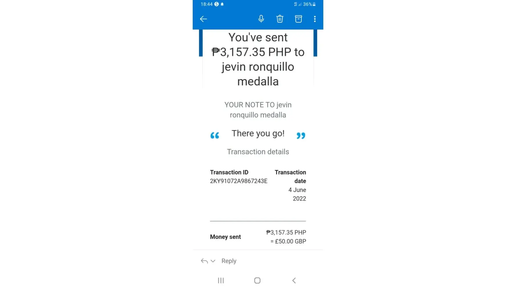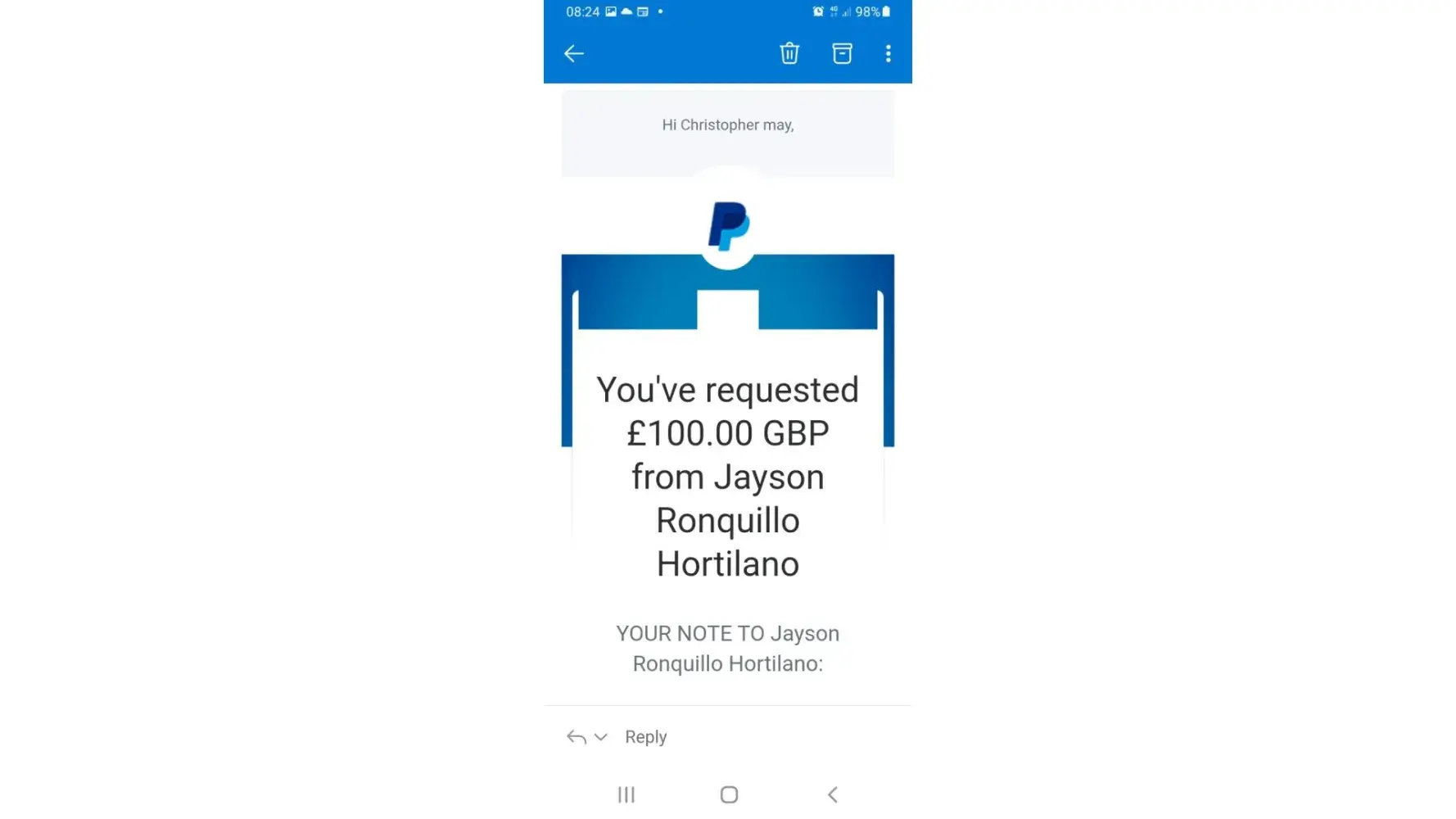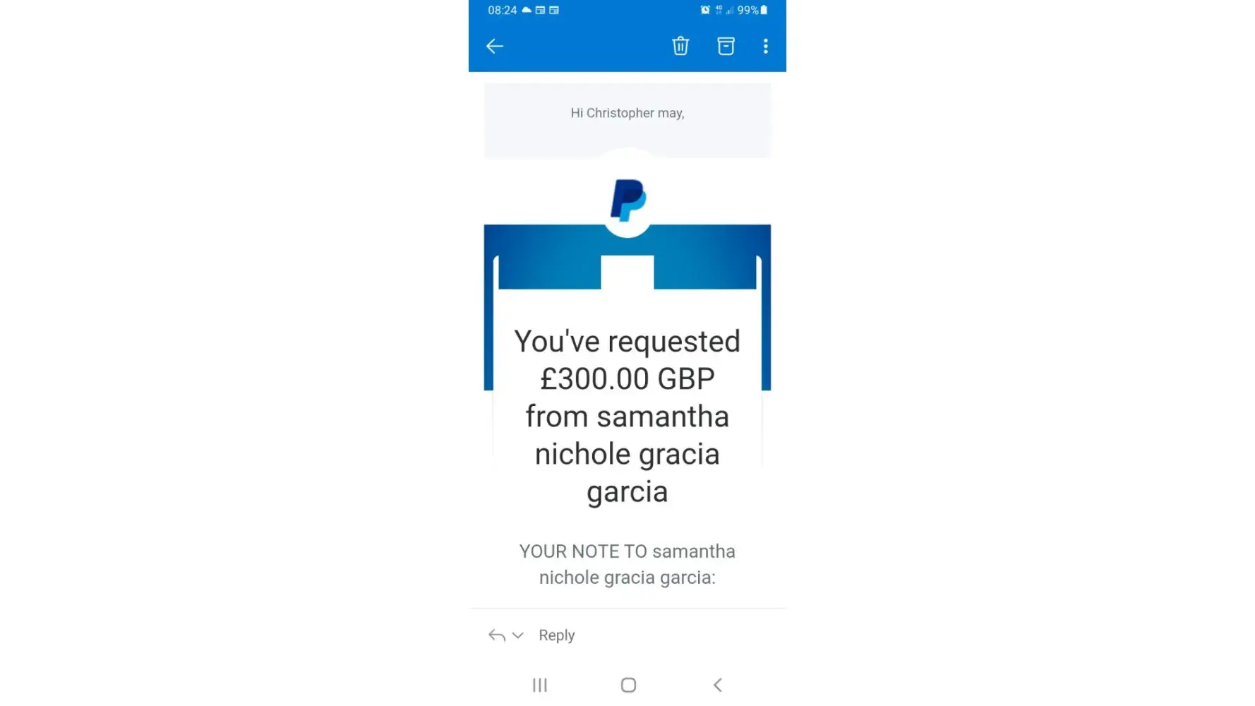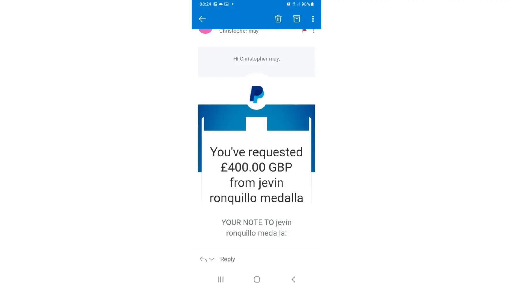 The first 3 payments where to a Samantha Nicole garcia each payment was£100 and they went out on23rd,29th and 30th of April then they bullied me into another payment of £100 to a jayson hortilano on the 1st of May and then made me pay another 4 payments of £100 on the 3rd of May to a Jevington medalla all through my PayPal account and was made to pay through friend's and family a d then they made me pay another £52.99 to jevin medalla on the 1st of June so as they said to finish the id process then I'd get my full refund but that never happened and the was another girl called liza thinson who kept pressuring me into making these payments so we could hook up but I think she was in on the scam to be far! I'm very pissed off that I fell into this trap I just want my money back as the put me into debt it's not right I informed the fraud squad they gave me a crime reference number but there not going forward with the investigation I don't know why I'd just like some help to get my refund and stop anybody else getting caught up with these scamming people. And another thing all the money was sent in Philippines currency?