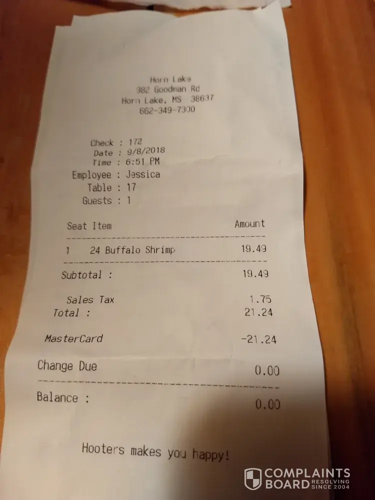 You have got a problem if you can't take initiative and actually get off yo' butt and complain to the management of the Hooters where you decided to go to get your boob fix. Yeah, I have been to Hooters and I didn't enjoy the hot wings- I didn't complain about it on line. I did something to help the company try to fix the problem!