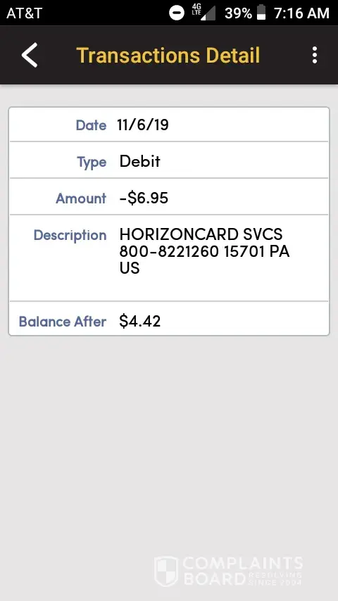 I have been charged $6.95 from horizon on my debit express debit card. I first started an application with them to check into it and after I seen it was $24.95 monthly fee I cancelled the process and I do not have a membership ID or card account with them so I'm not sure what they are charging me for since I cancelled it so if you cancel a process and that means I didn't authorize them to charge my debit card for anything since I didn't want their services