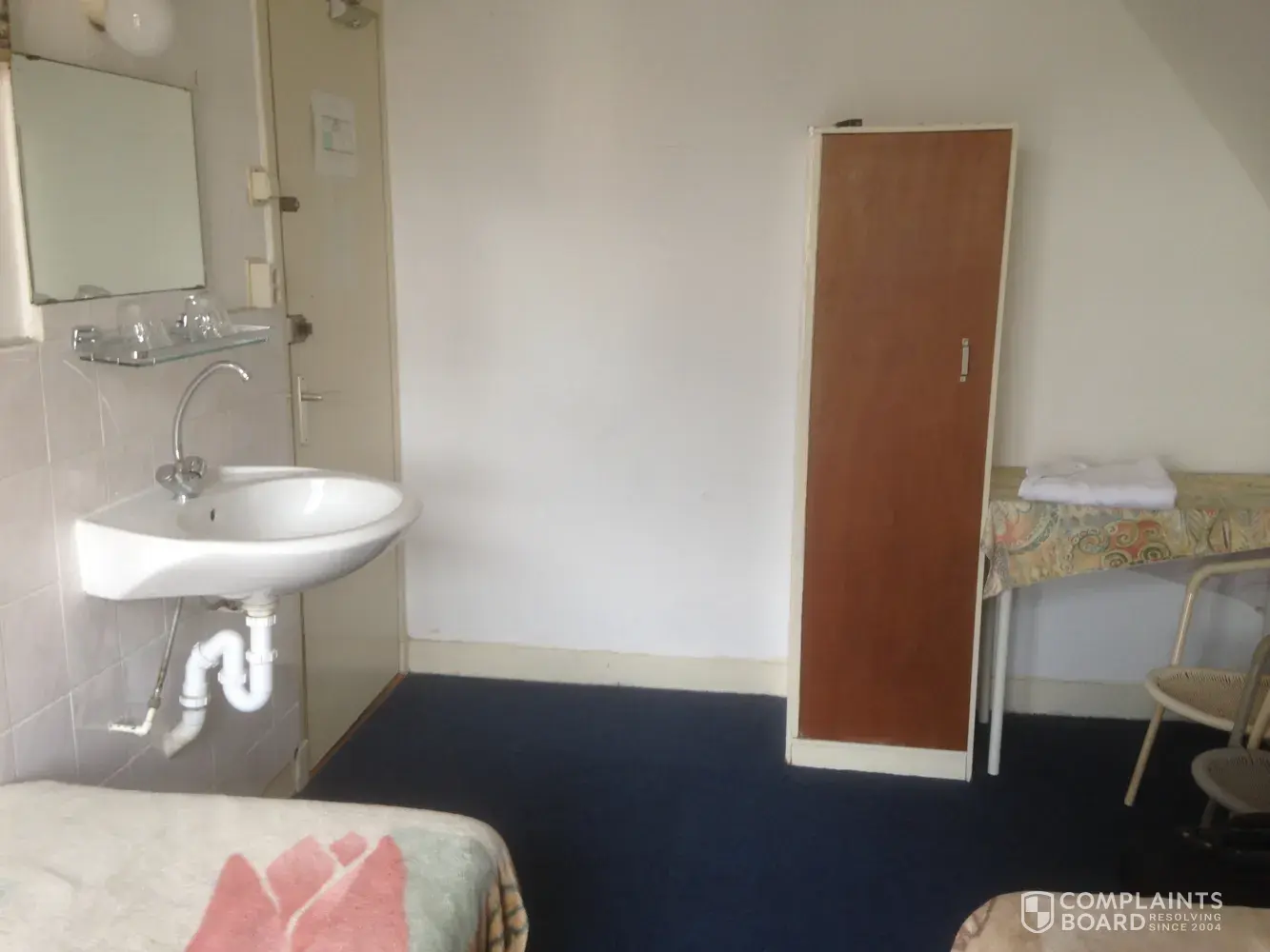 There are dirty sheets on the bed with stains over the blanket. In the room, you need to keep your shoes on its so filthy. As for the wardrobe it is unusable.