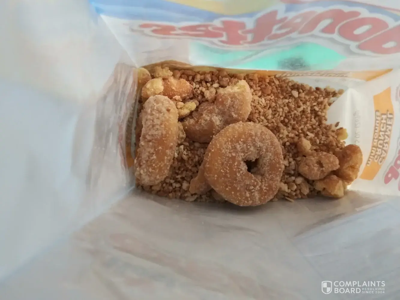 I purchased the bag at a local convince store at 4:50 am. Took them back to work and opened the bag to have a couple of the donuts. I took the first 3 out of the bag, they were whole but looked in the bag and all the rest were crumbs. Very disappointed and dissatisfied. I guess I'm not sure who to contact but figured I would start here because I think usually these are put in stores by people who deliver them to each business.