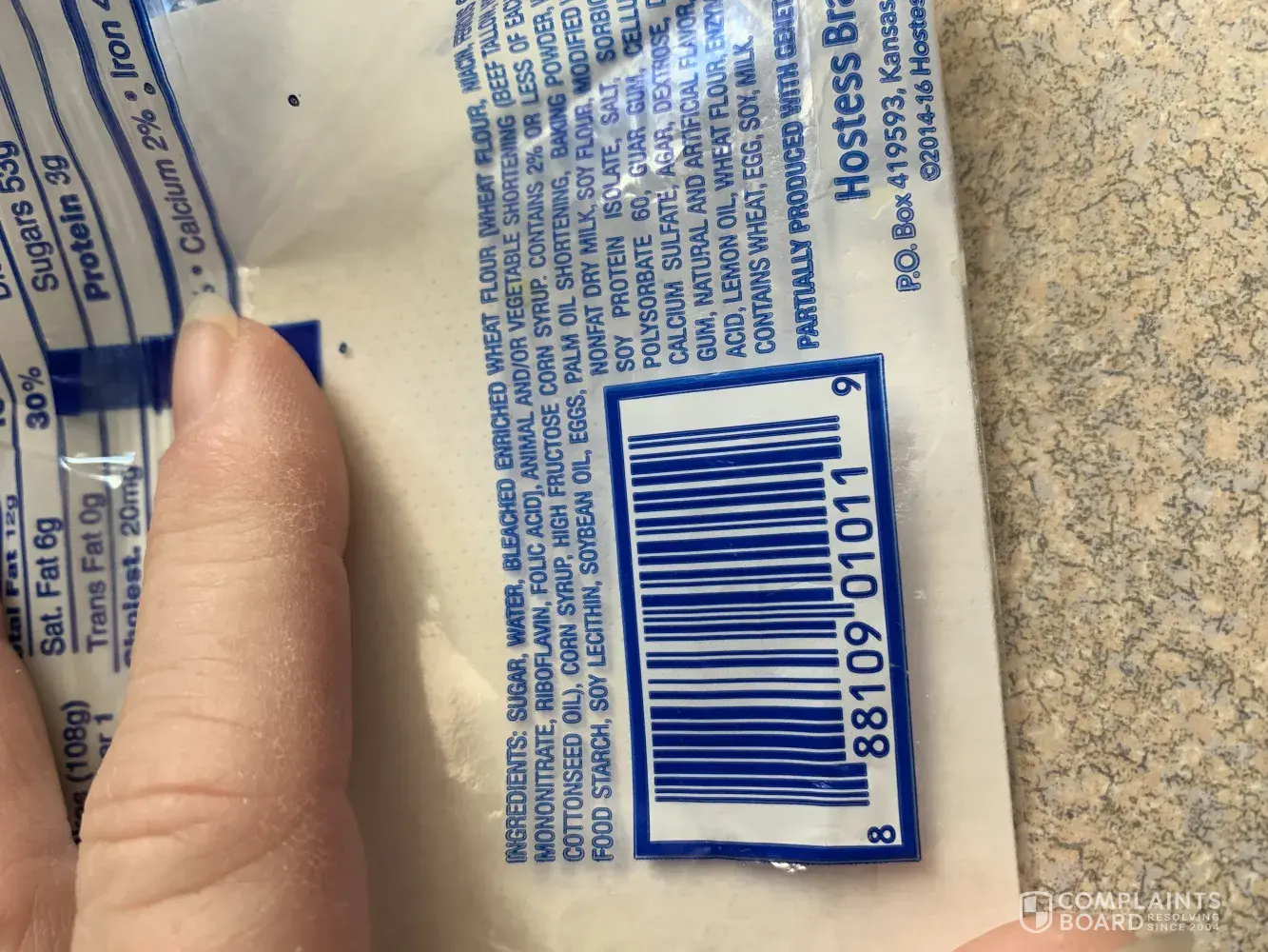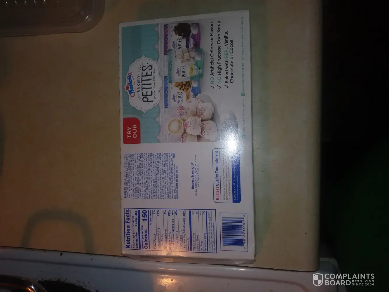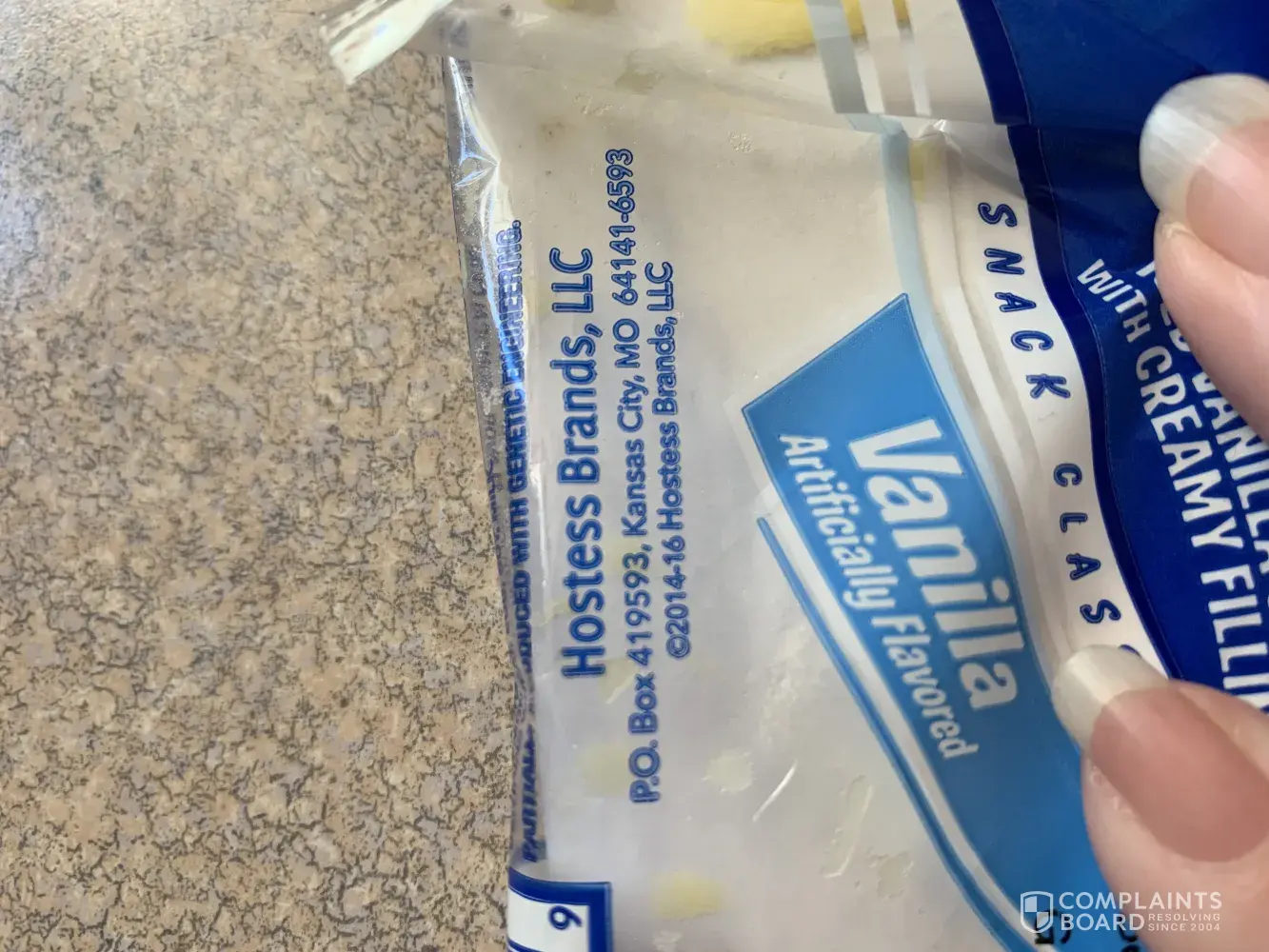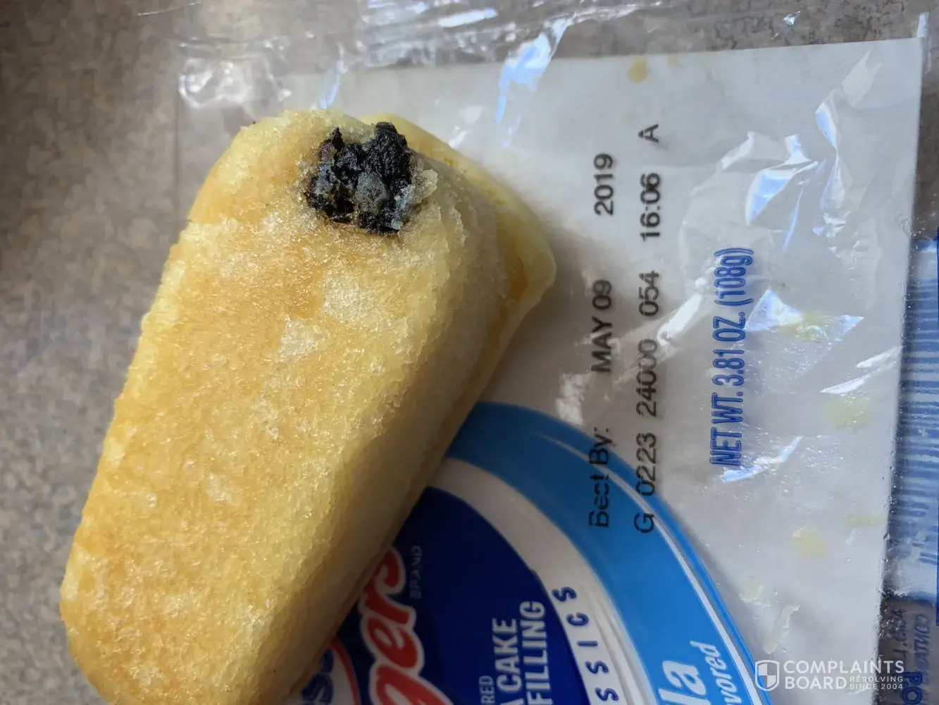 I had recently bought a 3 pack of your vanilla zingers. I had been eating them, when I went to eat the last one, I noticed that there was something dark black that looked like it was baked into the bottom end of it. Enclosed are a few pictures and the information that was on the package as far as date and some kind of a code. I would greatly appreciate it if maybe you could send a coupon for another 3 pack?