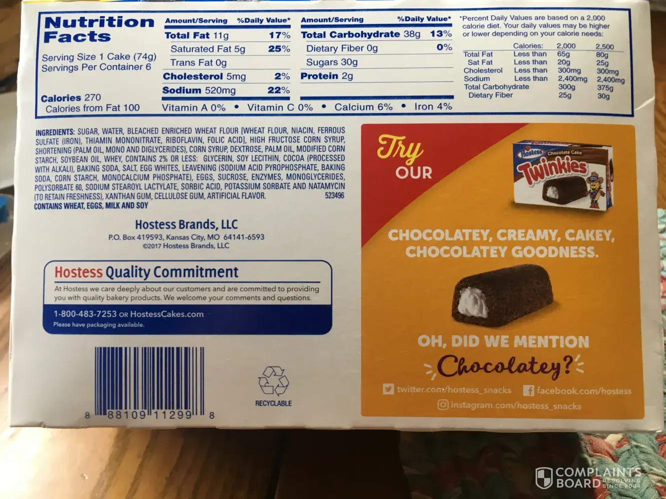 On july 16, 2018, I purchased a package of hostess bakery petites, white fudge vanilla cake delights from tops market on east ridge road, in rochester, ny. This item, according to the bag, was a new product, so I thought I thought I would try it. According to the description on the bag, it contained 4 servings per container and the serving size was 3 mini cakes. The picture on the package looked delicious, and the fact that the item was white fudge vanilla made it more enticing since I have an allergy to regular chocolate and the size made it perfect for an evening snack for my husband and me. I was greatly disappointed when I opened the package and found that there were seven whole mini cakes and the crumbs and pieces from what appeared to be three other cakes. Yes, the little cakes were tasty and we did enjoy them but I felt that the condition of the product was not good and the serving size was misrepresented.