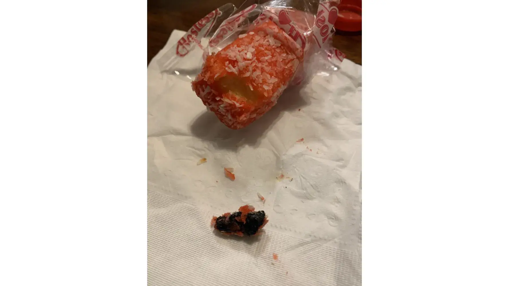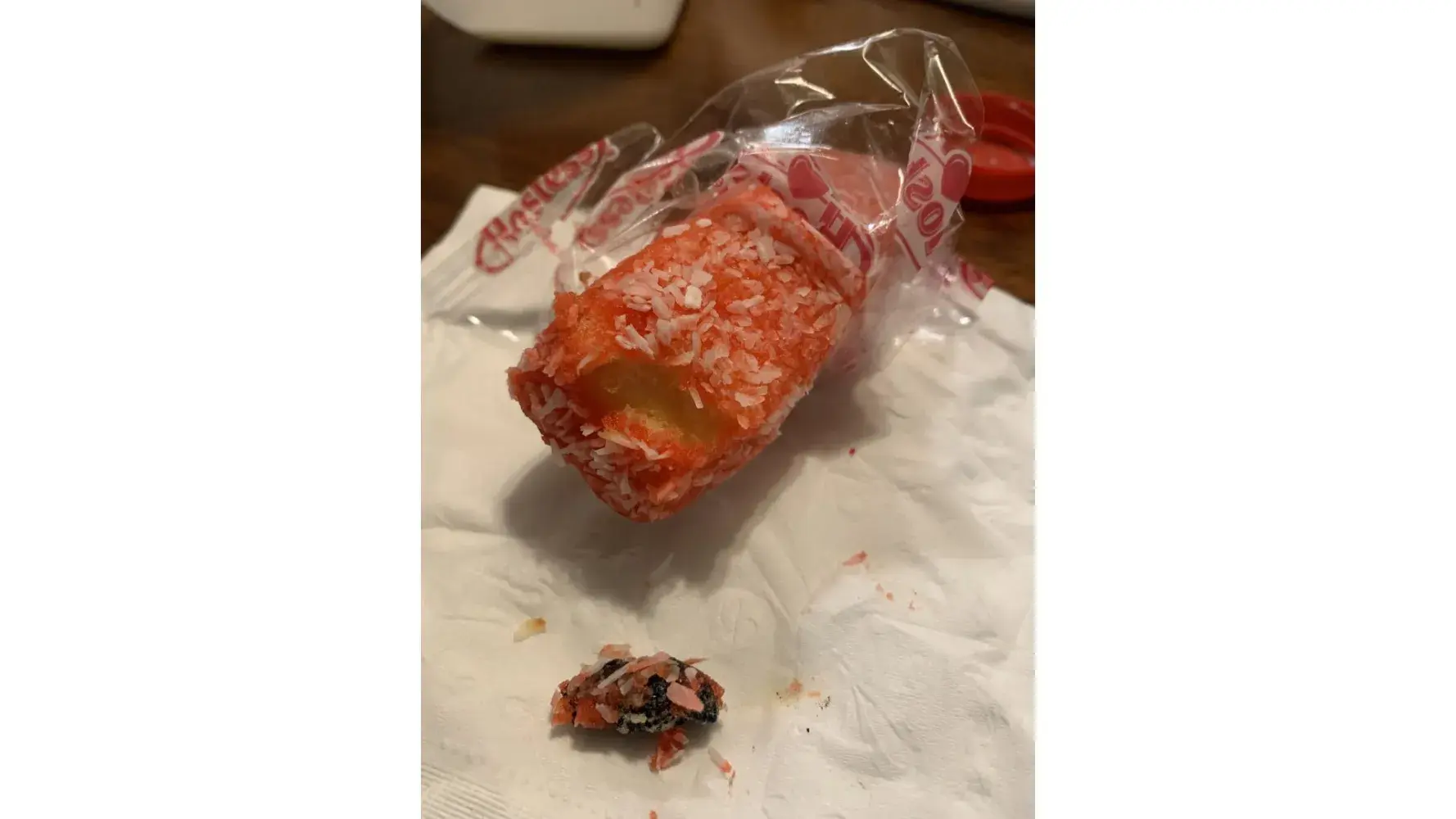 Hi I just bought a box of strawberry cupcakes. My husband opened the package and seen one with something black in the cupcake. We don't know what it is but it looks like a strip of leather. We're parents of a 2 year old and we could've gave our child the cupcake without even really paying attention cause we eat hostess all the time. We love your snack cakes.